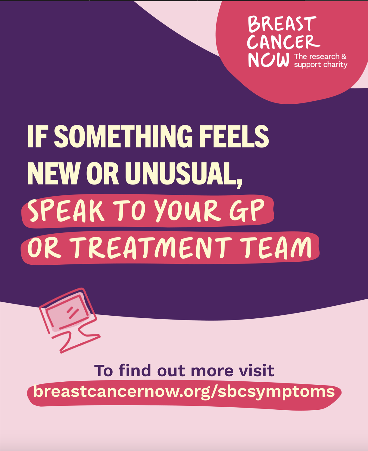 Speak to your GP or breast care nurse if you have any new symptoms that: