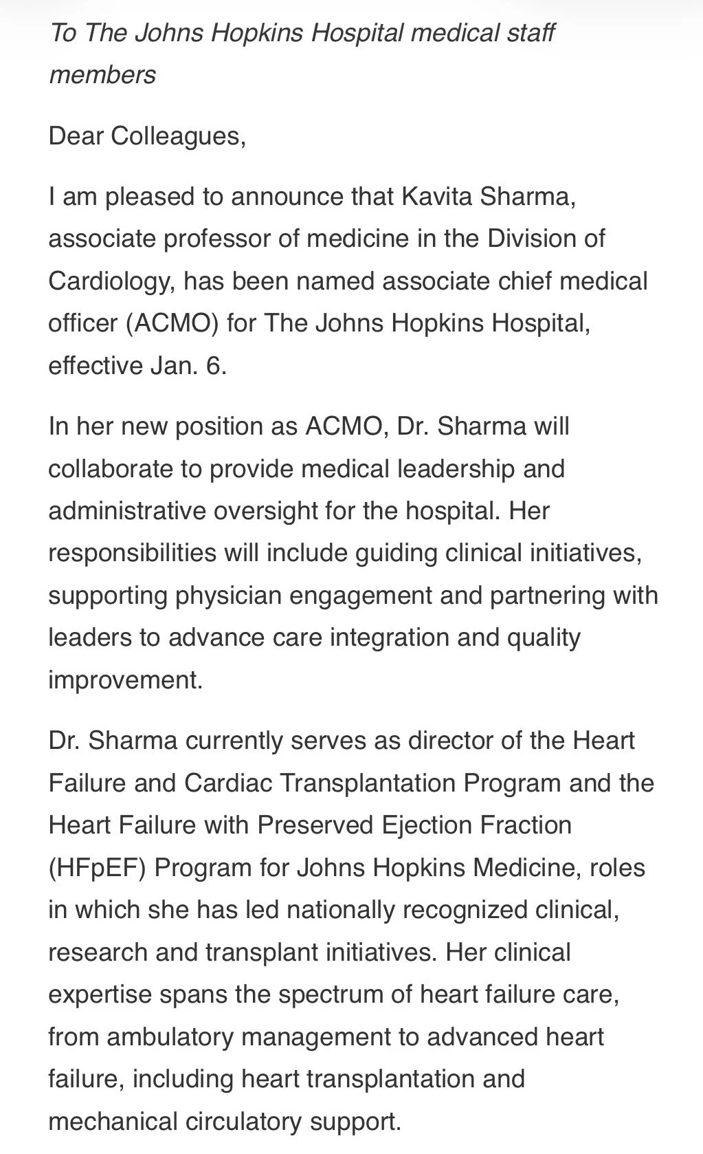 “With deep gratitude and honor I will be embarking on a new role as Associate Chief Medical Officer (ACMO) of The Johns Hopkins Hospital, Johns Hopkins Medicine as of January 2026.