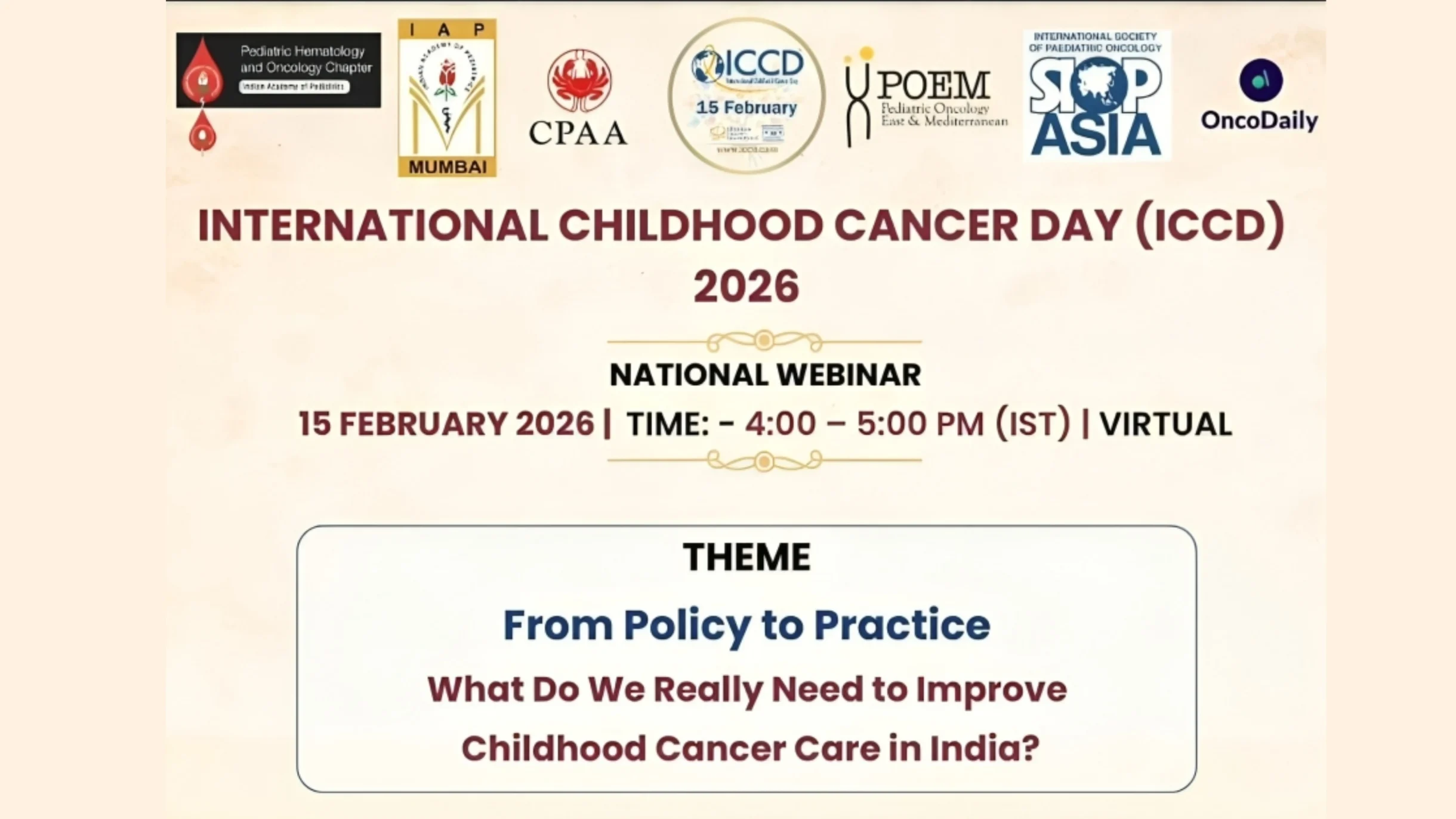 Centered on the theme, “From Policy to Practice: What Do We Really Need to Improve Childhood Cancer Care in India?” the virtual session (15 February 2026 | 4:00–5:00 PM IST) will focus on translating policy frameworks into real-world improvements in diagnosis, treatment access, survivorship, and patient support systems.