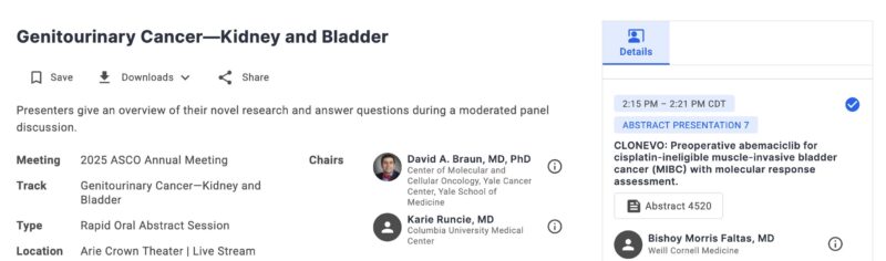 Abstract Title: CLONEVO: Preoperative abemaciclib for cisplatin-ineligible muscle-invasive bladder cancer (MIBC) with molecular response assessment.