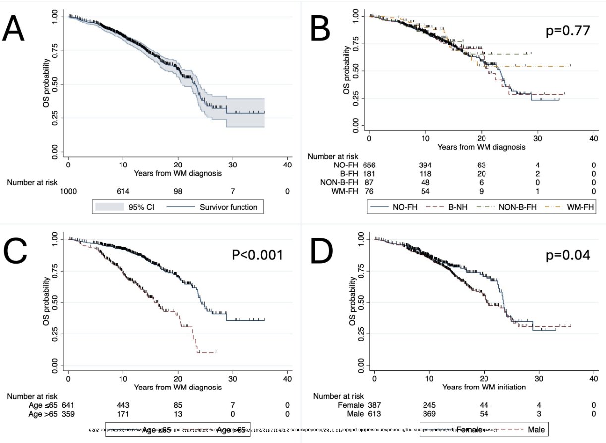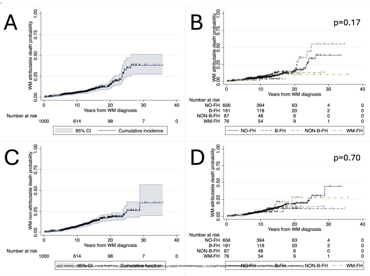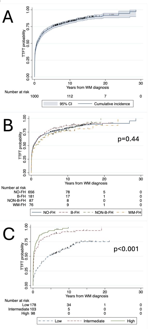 Study of familial clusters and clinical features, complications, and outcomes in 1000 patients with Waldenström finds more women in the WM-family history cluster, higher odds of Bing-Neel syndrome, no impact on TTFT, SAFTI, or OS.”