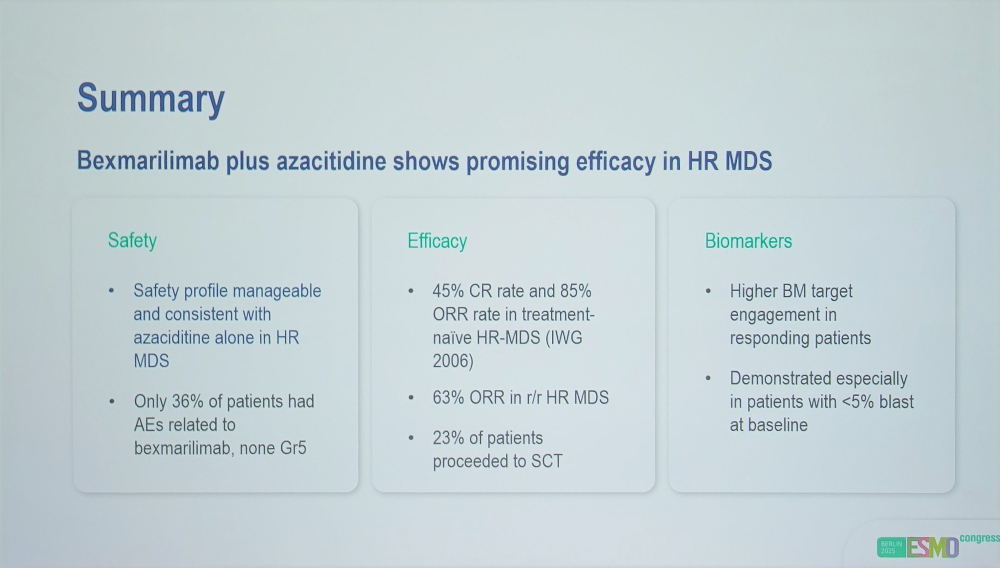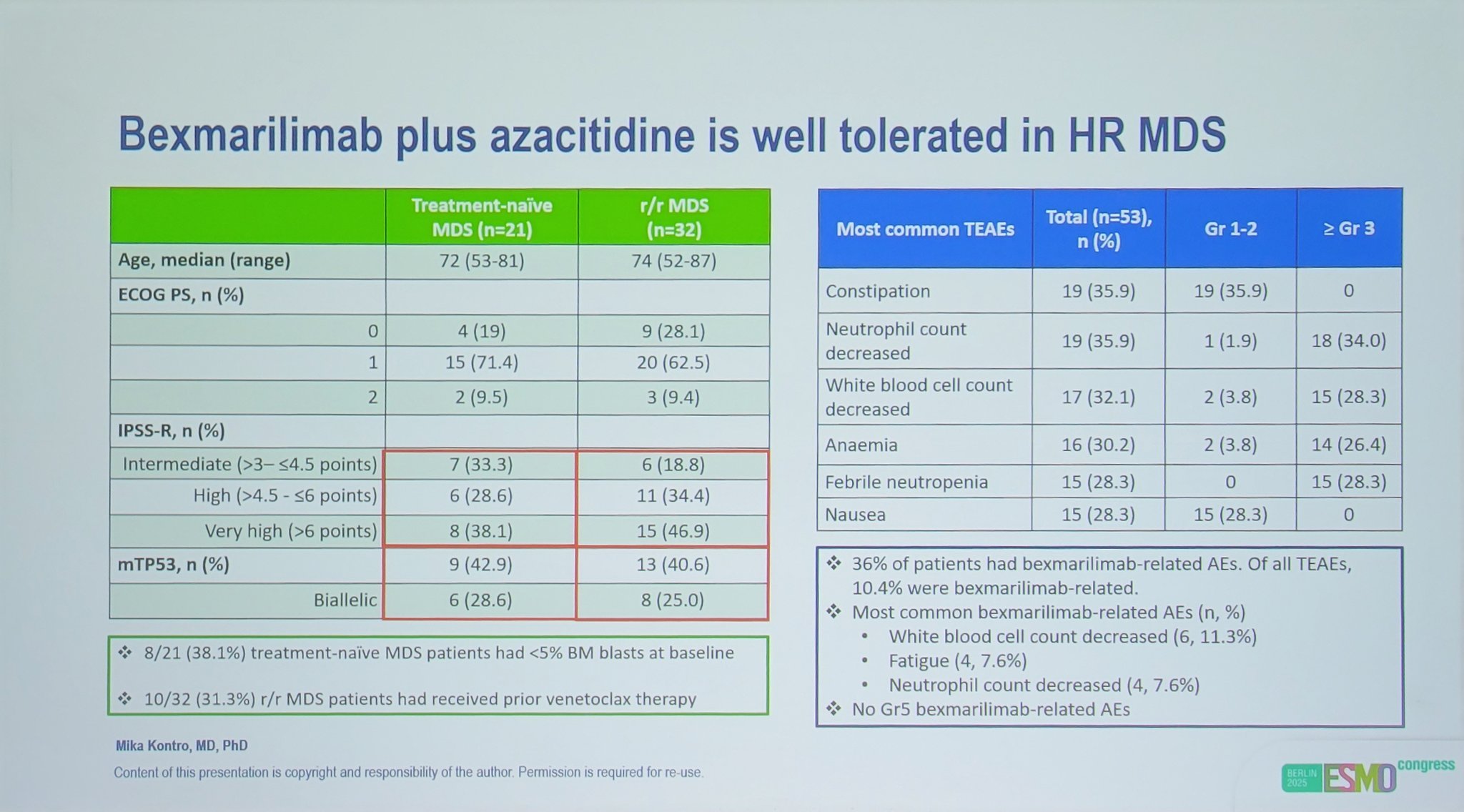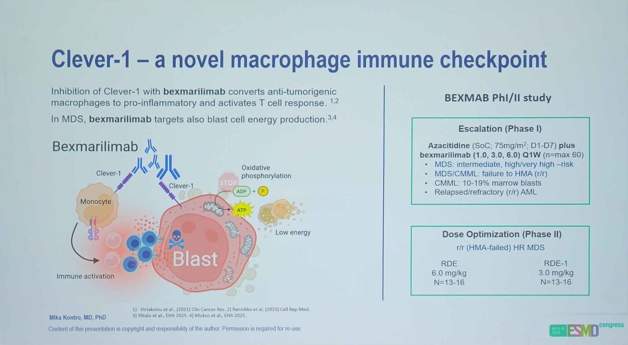 “Data presented at ESMO25 by Dr Mika Kontro on the Macrophage reprogrammer bexmarilimab plus azacitidine in myelodysplastic syndrome (BEXMAB).”