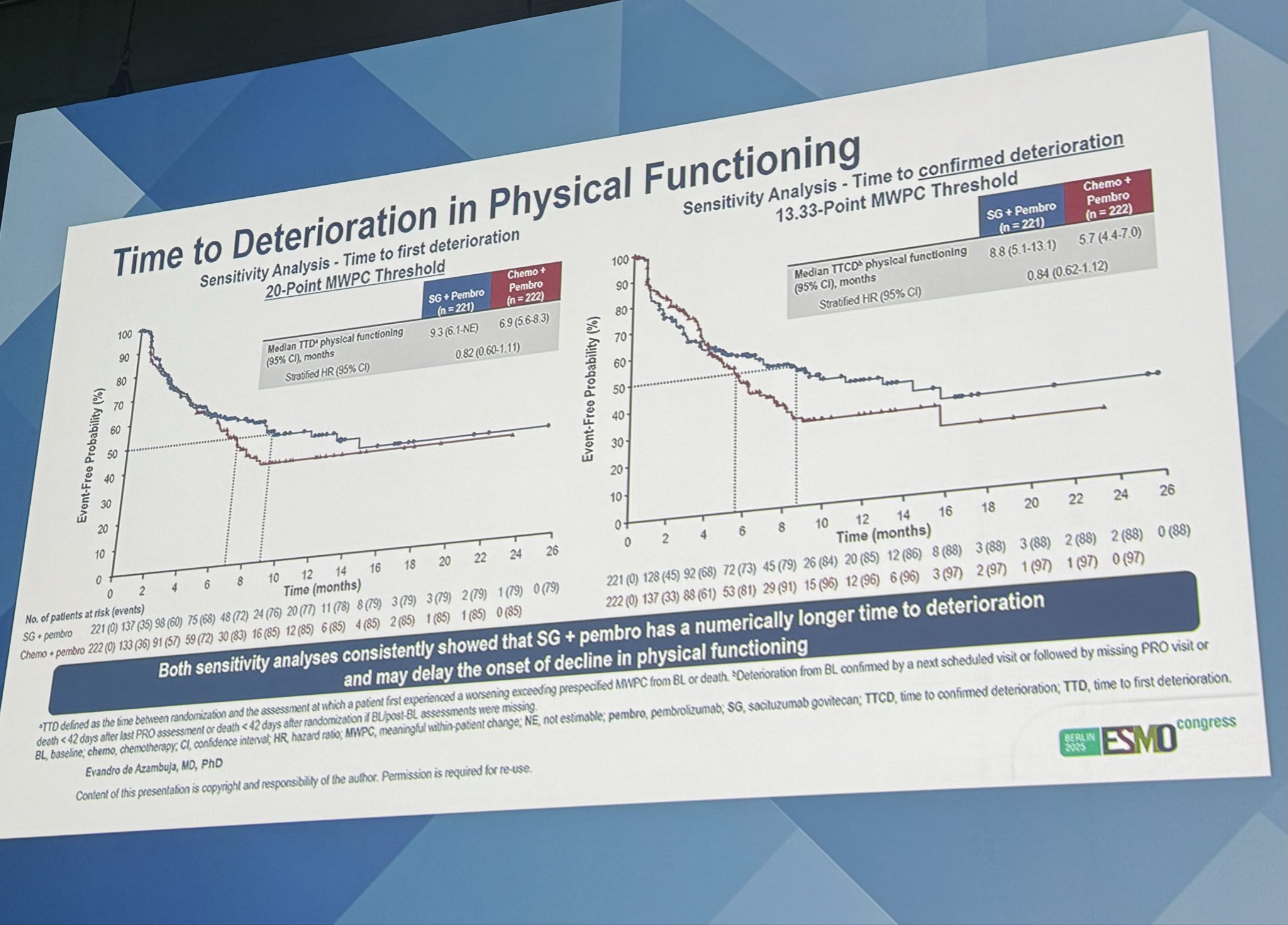 ASCENT-04, SG+pembro maintained QoL vs chemo+pembro in PD-L1+ mTNBC, with improved emotional function (HR 0.71), less pain (0.75) and insomnia (0.75), consistent safety profile.”