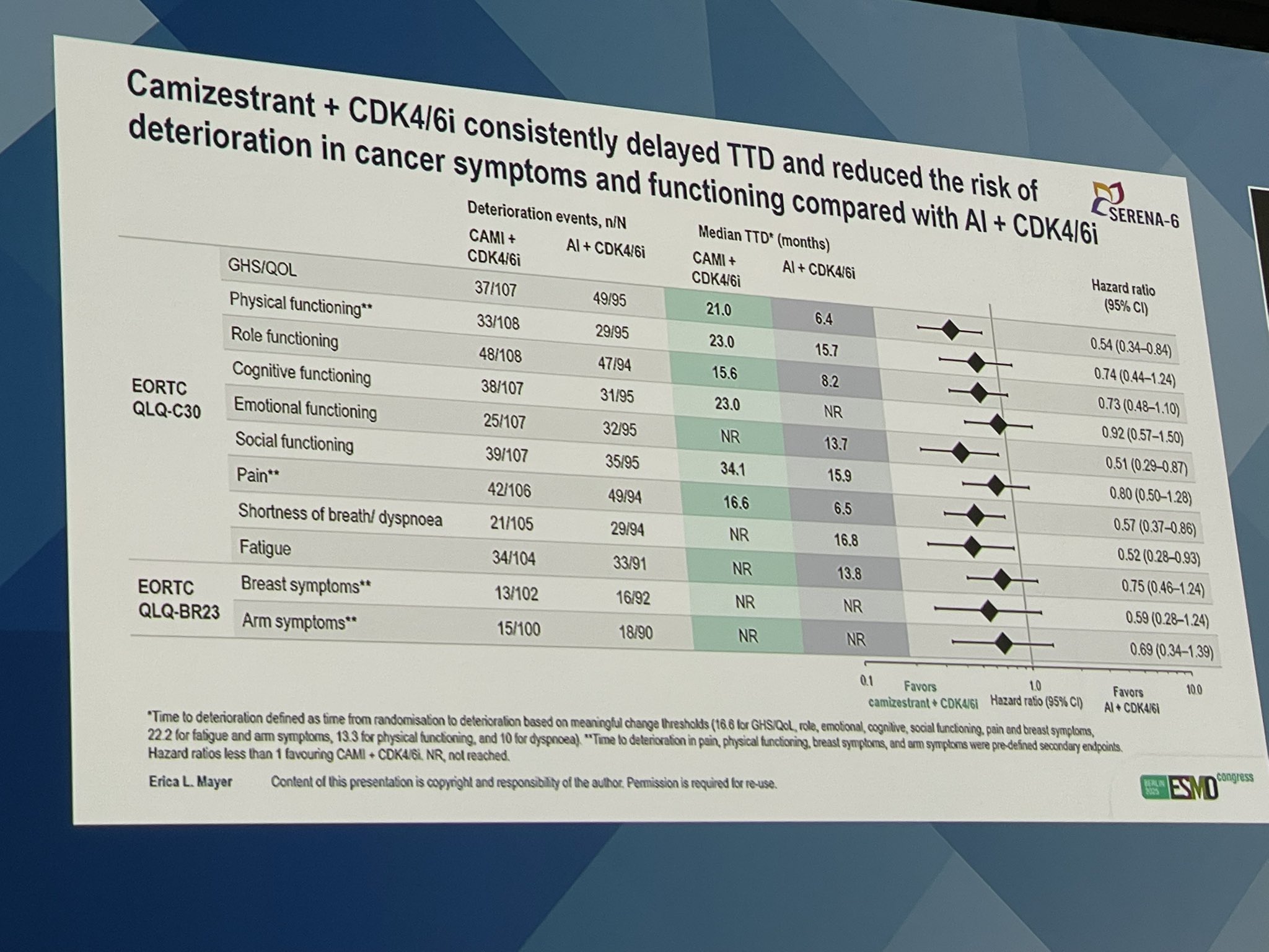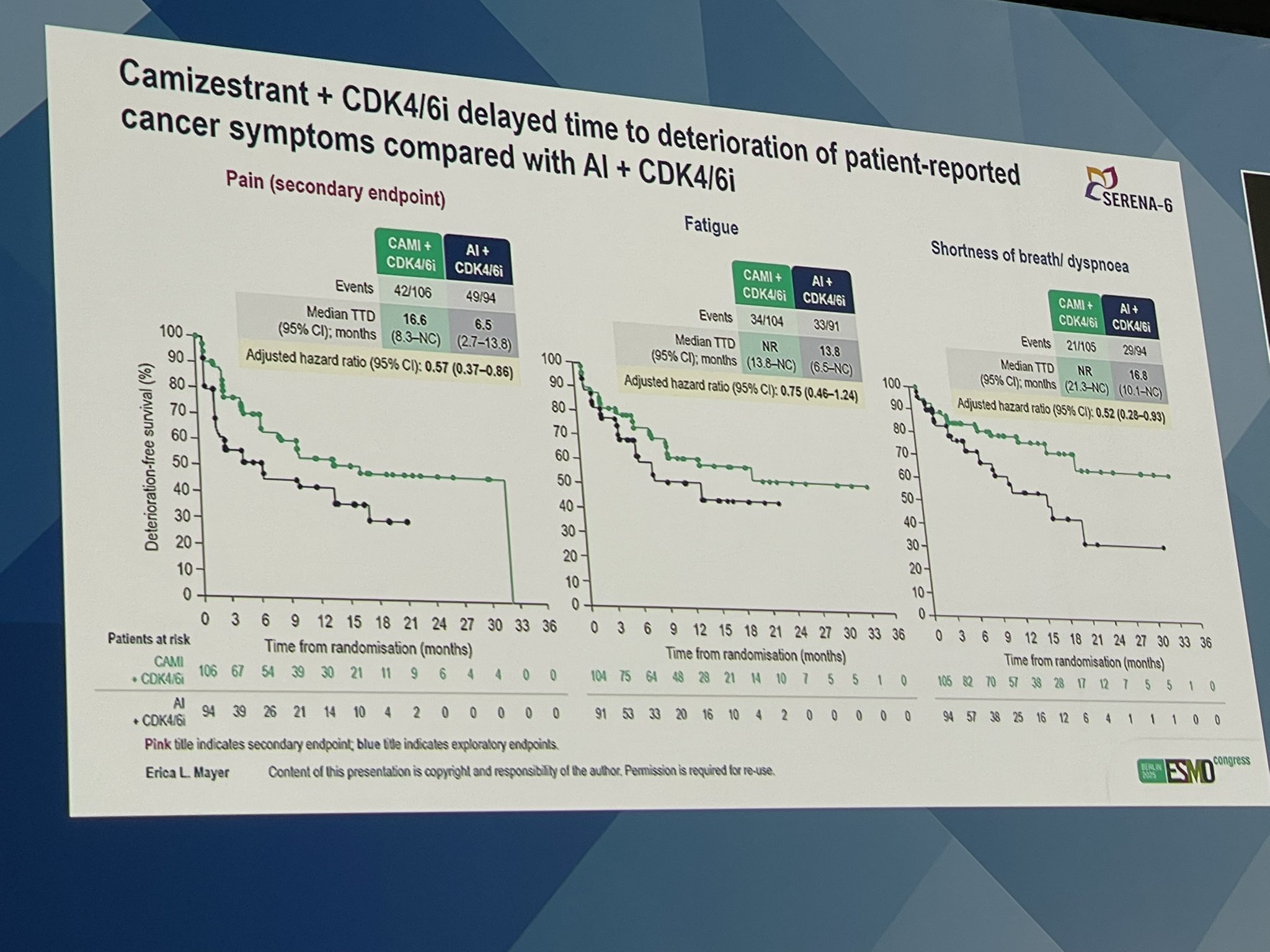 In SERENA 6, early shift to camizestrant demonstrated consistent benefit in delayed time to deterioration of PRO cancer symptoms (pain, fatigue, dyspnoea) and functioning.”