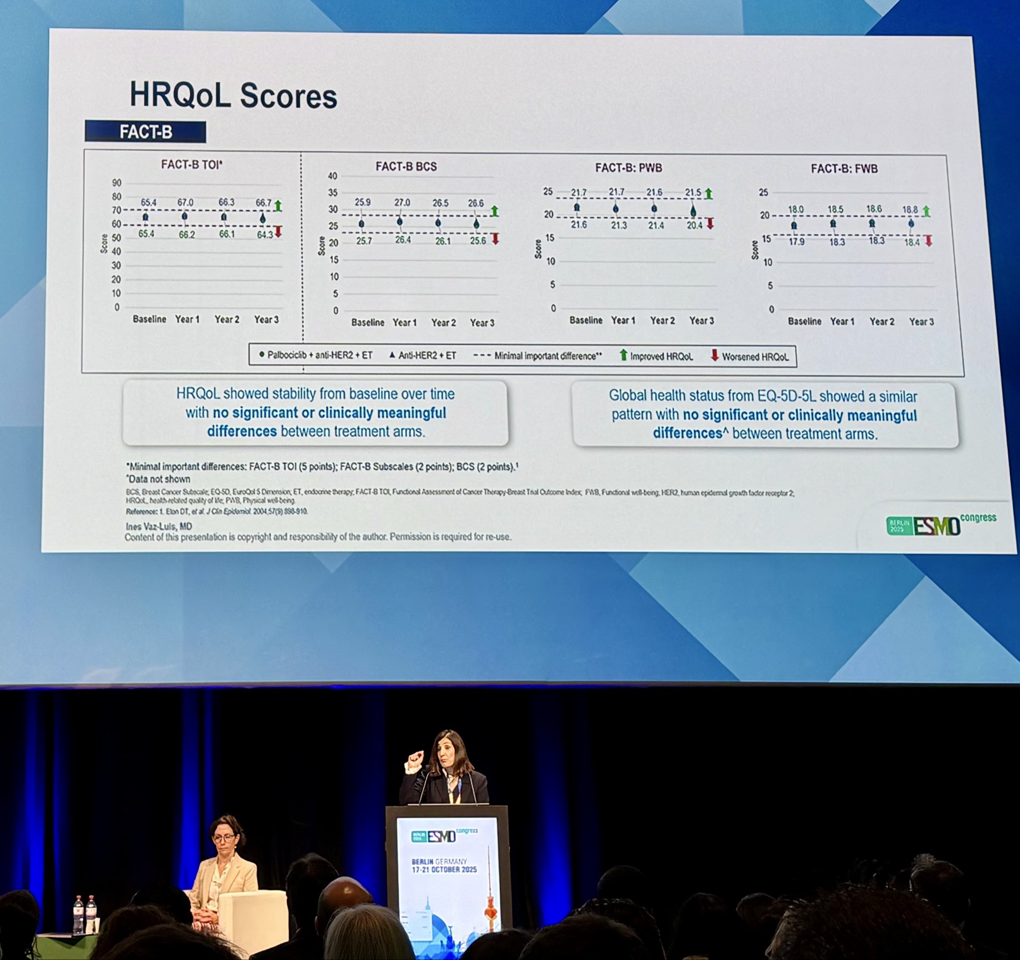 HRQoL results from the practice-changing PATINA (AFT-38) trial show that adding palbociclib to HER2 therapy + ET preserves quality of life over long-term treatment, supporting its role in HR+/HER2+ MBC as 1st line treatment.”