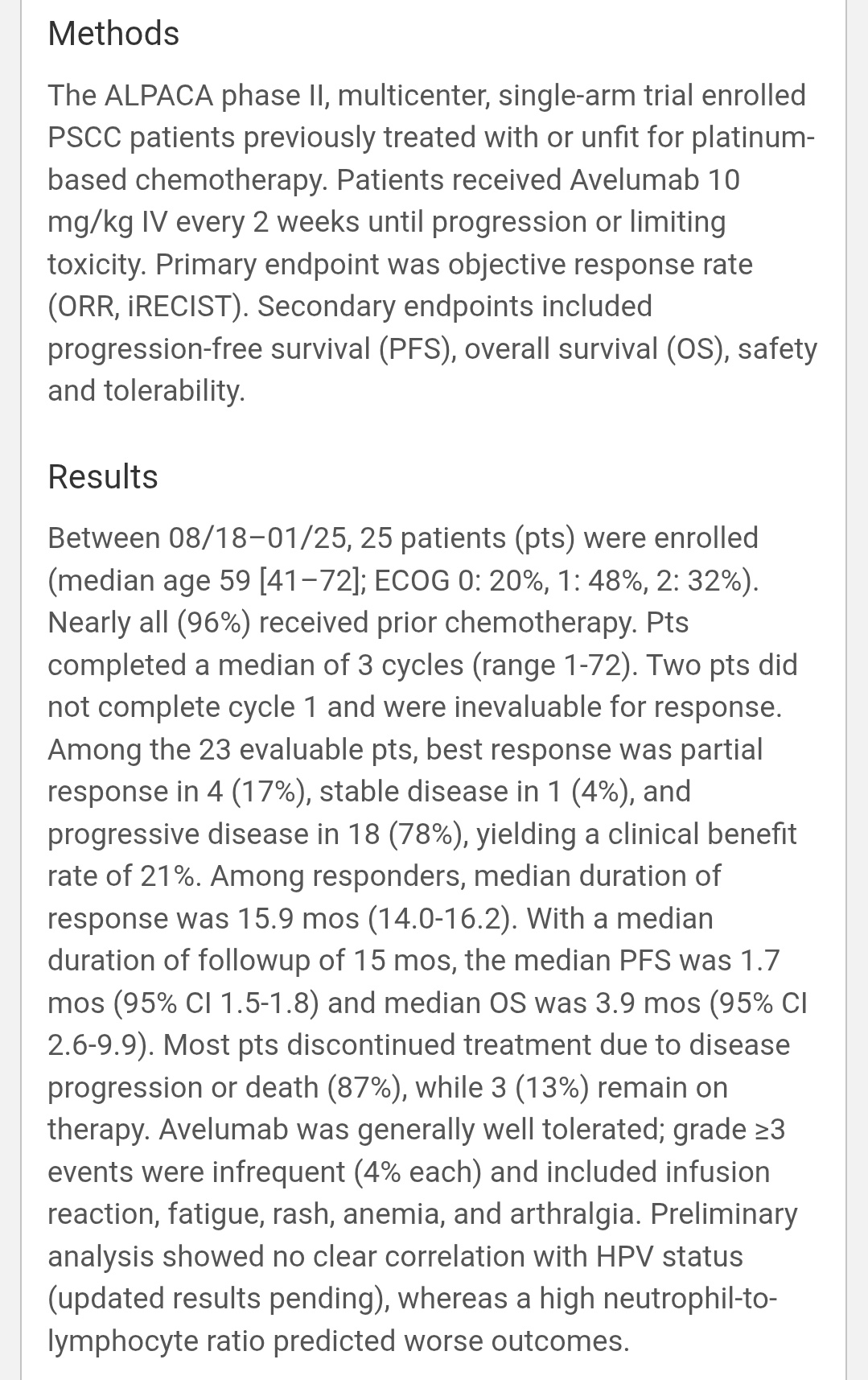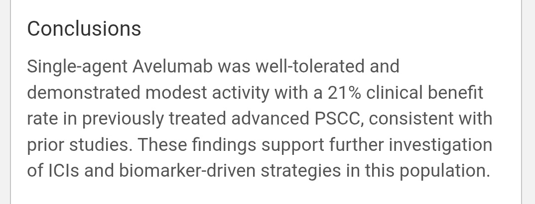Well-tolerated; grade ≥3 AEs only ~4%. High neutrophil-to-lymphocyte ratio → worse outcomes. HPV status not clearly predictive. Modest efficacy but durable responses in a rare, hard-to-treat cancer.