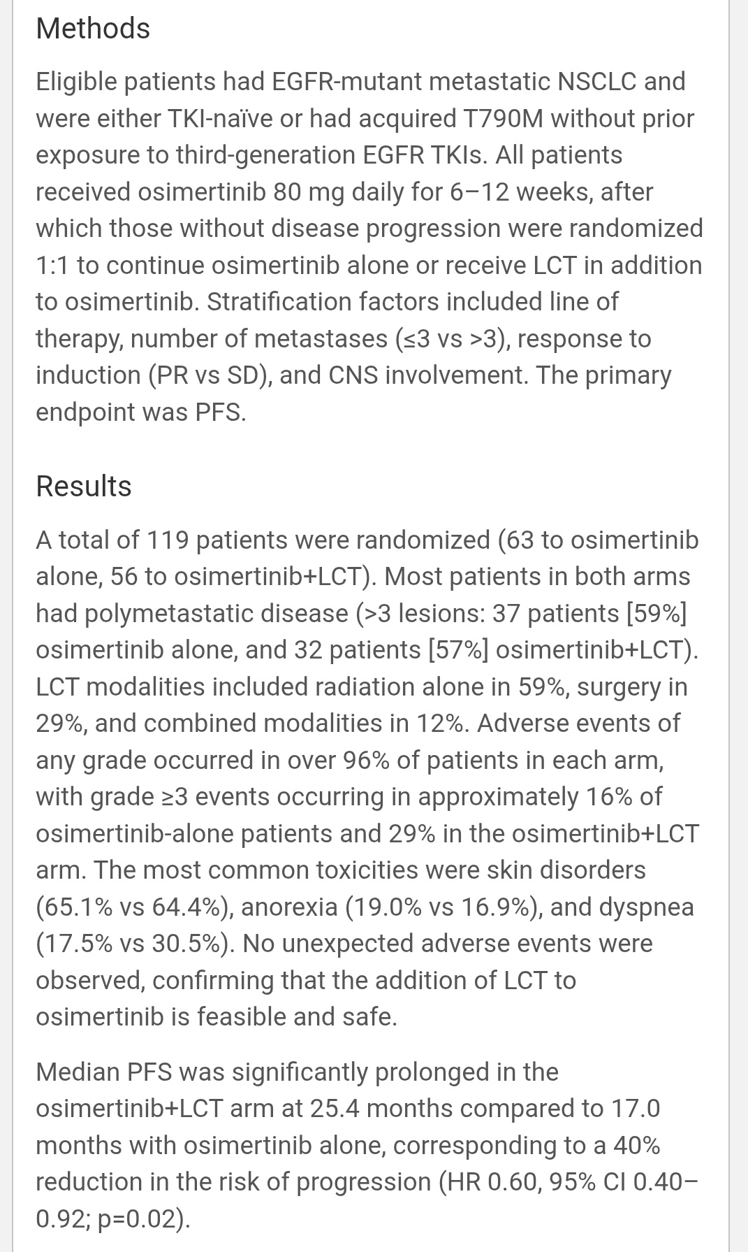 Implication: Even in polymetastatic EGFR NSCLC, adding LCT yields 40 % lower risk of progression.