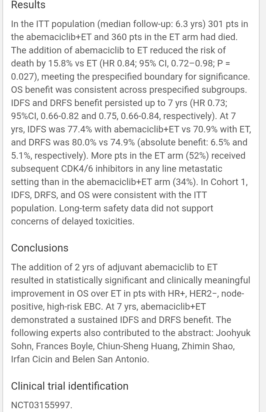 Benefit consistent across subgroups, durable beyond therapy end, despite crossover (52% ET-alone later got CDK4/6i). Conclusion – First CDK4/6i to show OS gain in early HR+ breast cancer. Abemaciclib now cements its place as standard of care for high-risk adjuvant setting.”