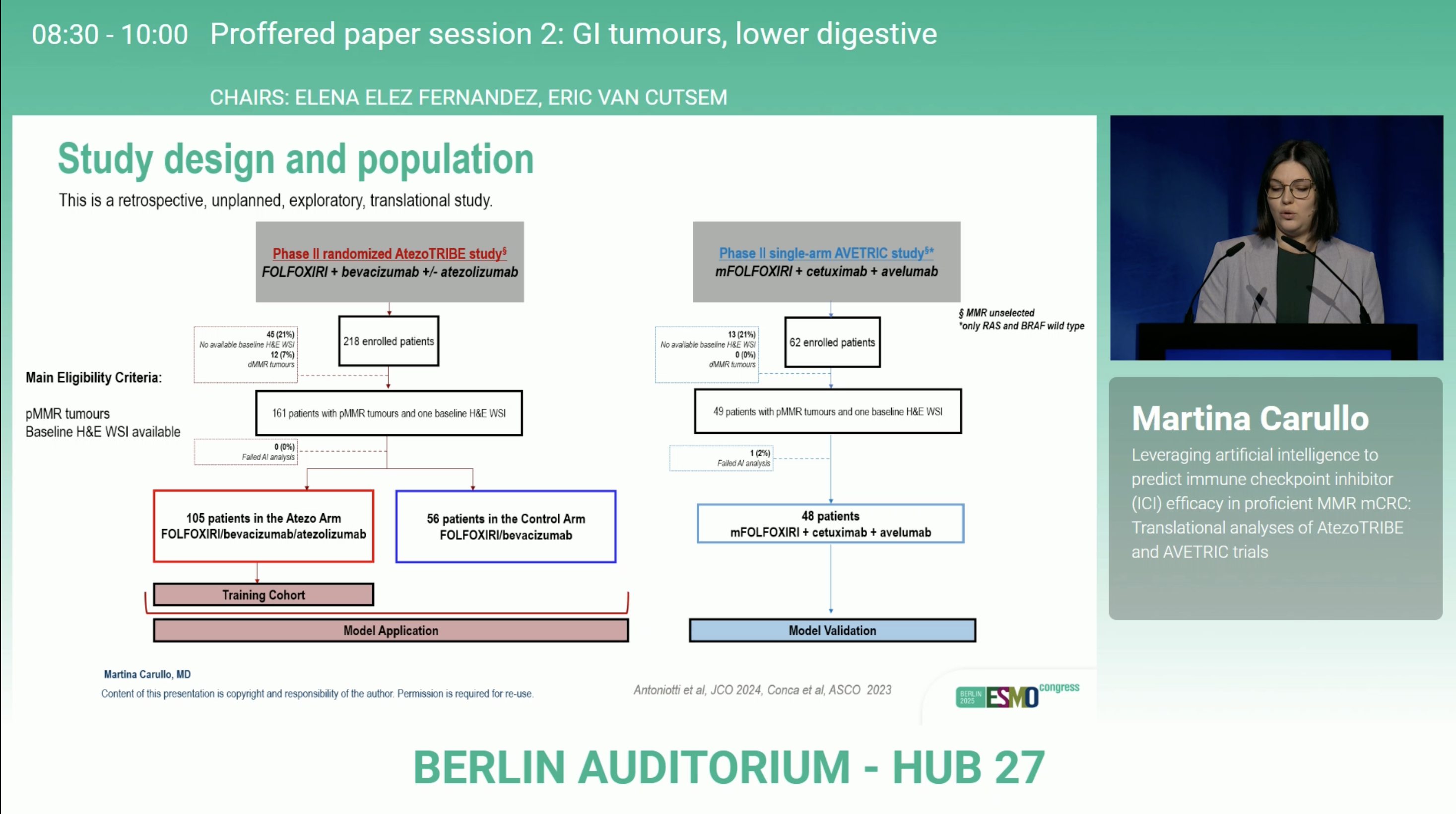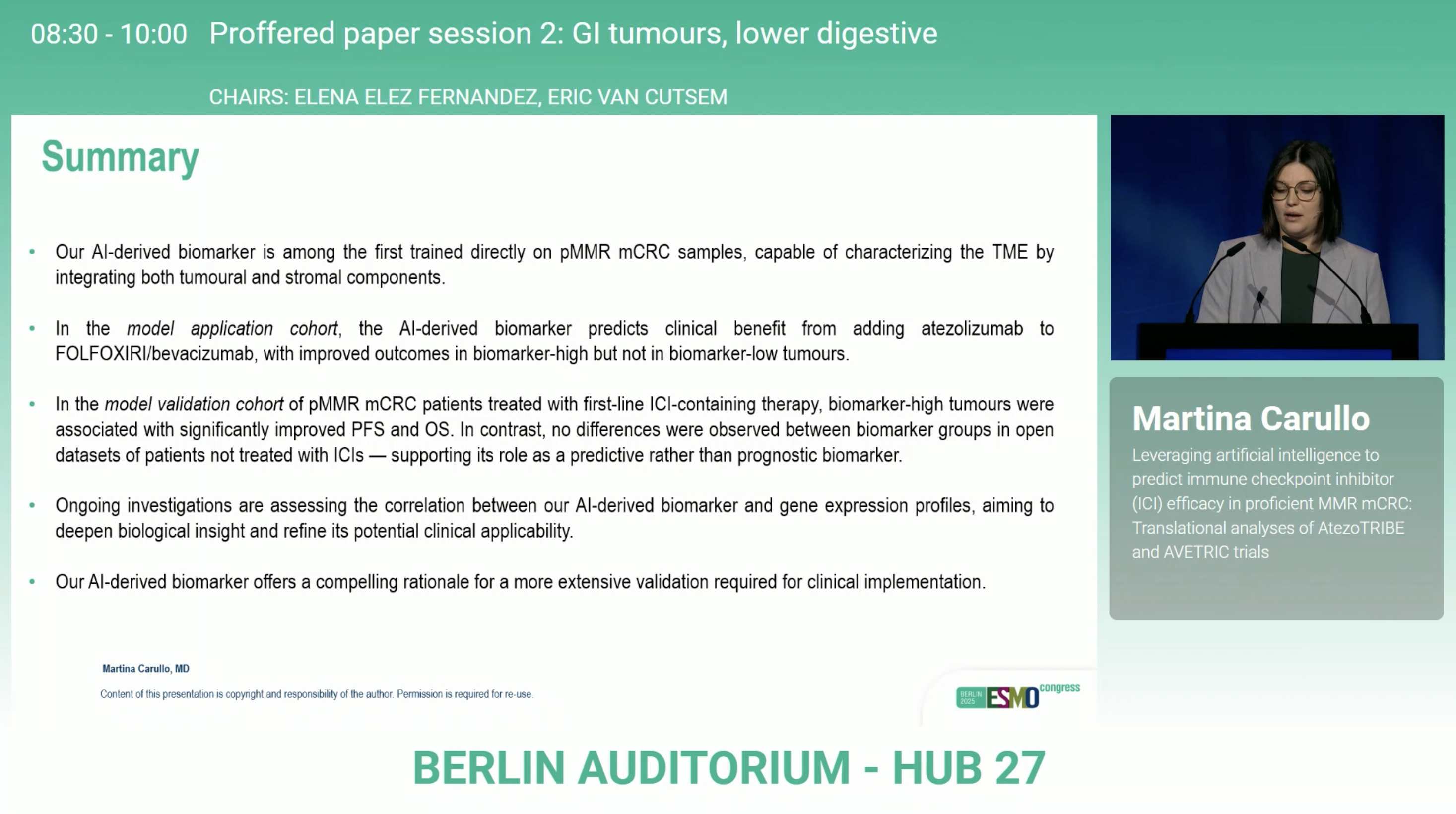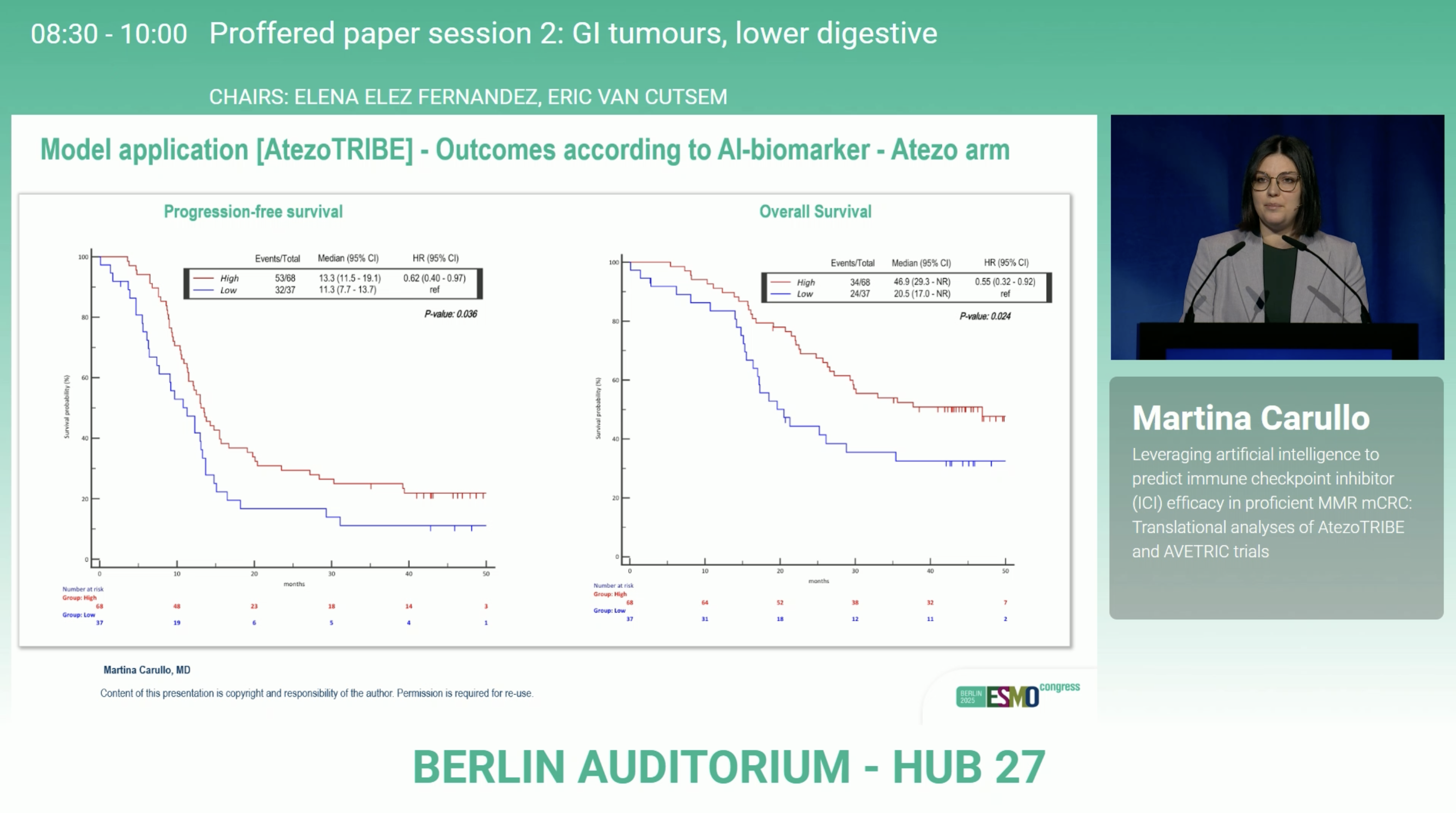 At the ESMO Congress 2025 in Berlin, Dr. Martina Carullo (Pisa, Italy) presented groundbreaking findings from the translational program of AtezoTRIBE and AVETRIC, two clinical trials exploring immunotherapy in proficient mismatch repair (pMMR) metastatic colorectal cancer (mCRC). Using the Lunit SCOPE IO artificial intelligence (AI) platform, the investigators developed and validated a digital biomarker capable of predicting which pMMR tumors benefit from immune checkpoint inhibition—an area long considered resistant to immunotherapy.
