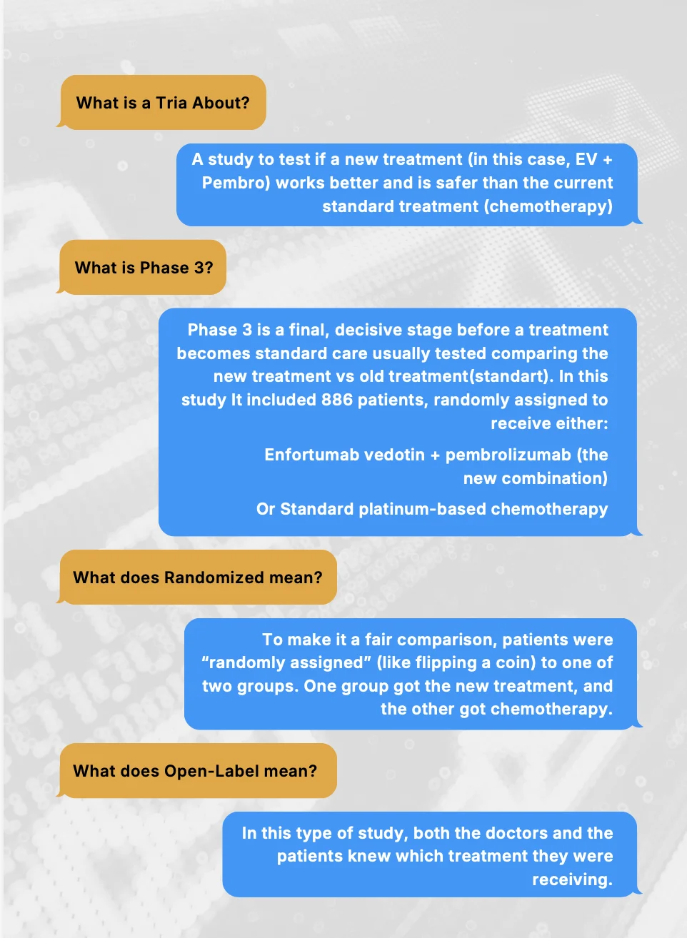 The EV-302/ KEYNOTE-A39 trial looked at people with locally advanced or metastatic urothelial carcinoma, the most common type of bladder cancer, who had not yet received treatment for advanced disease. Researchers compared two first-line treatment options: