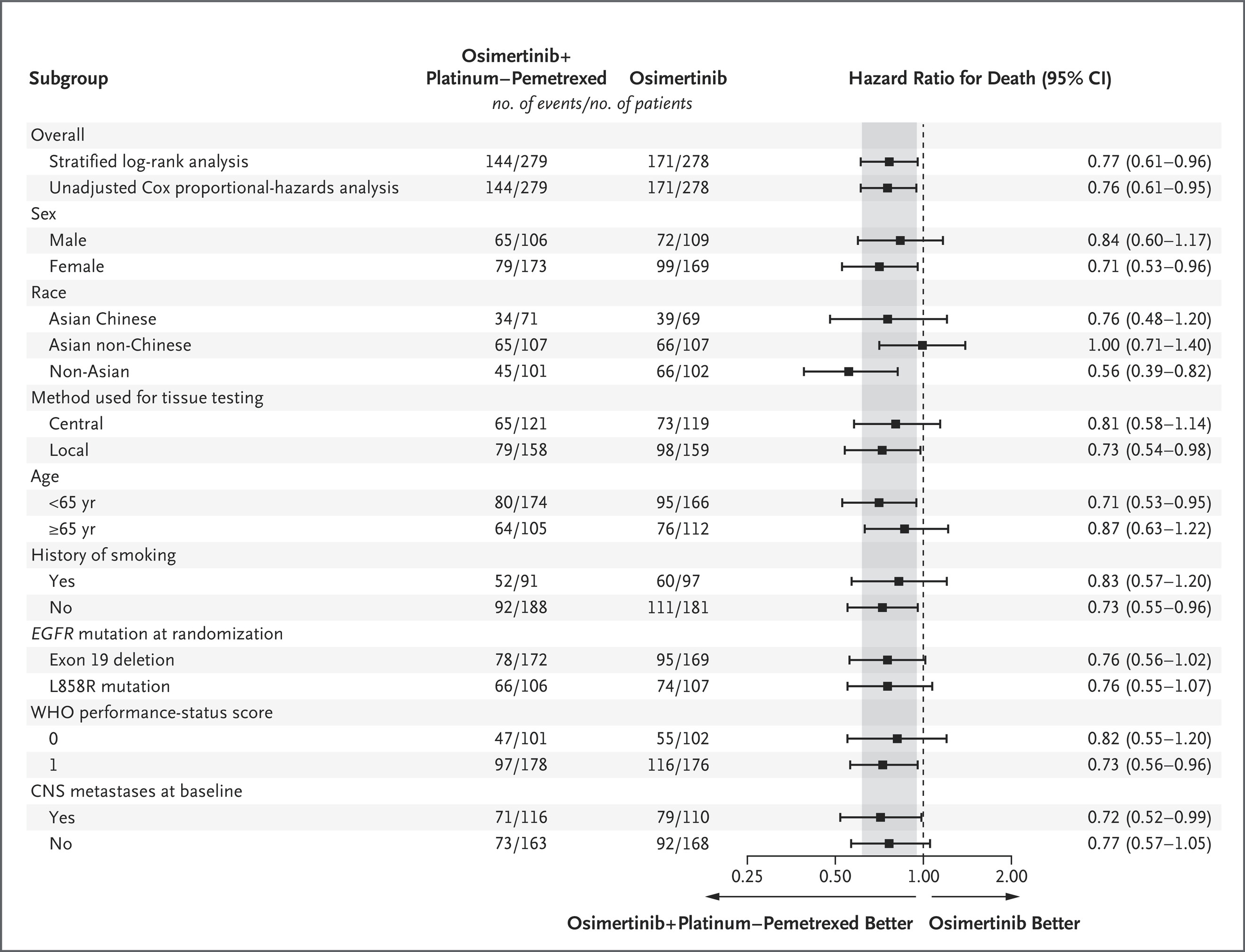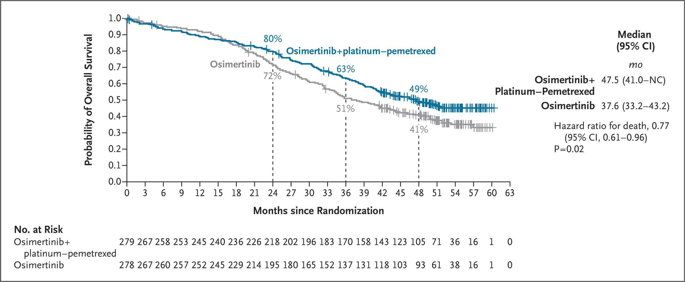 A total of 557 patients were included: 279 in the osimertinib + CTx arm and 278 in the osimertinib monotherapy arm. The overall hazard ratio (HR) for OS was 0.77 (95% CI 0.61–0.96; p=0.02), corresponding to a 23% reduction in risk of death with the combination regimen.