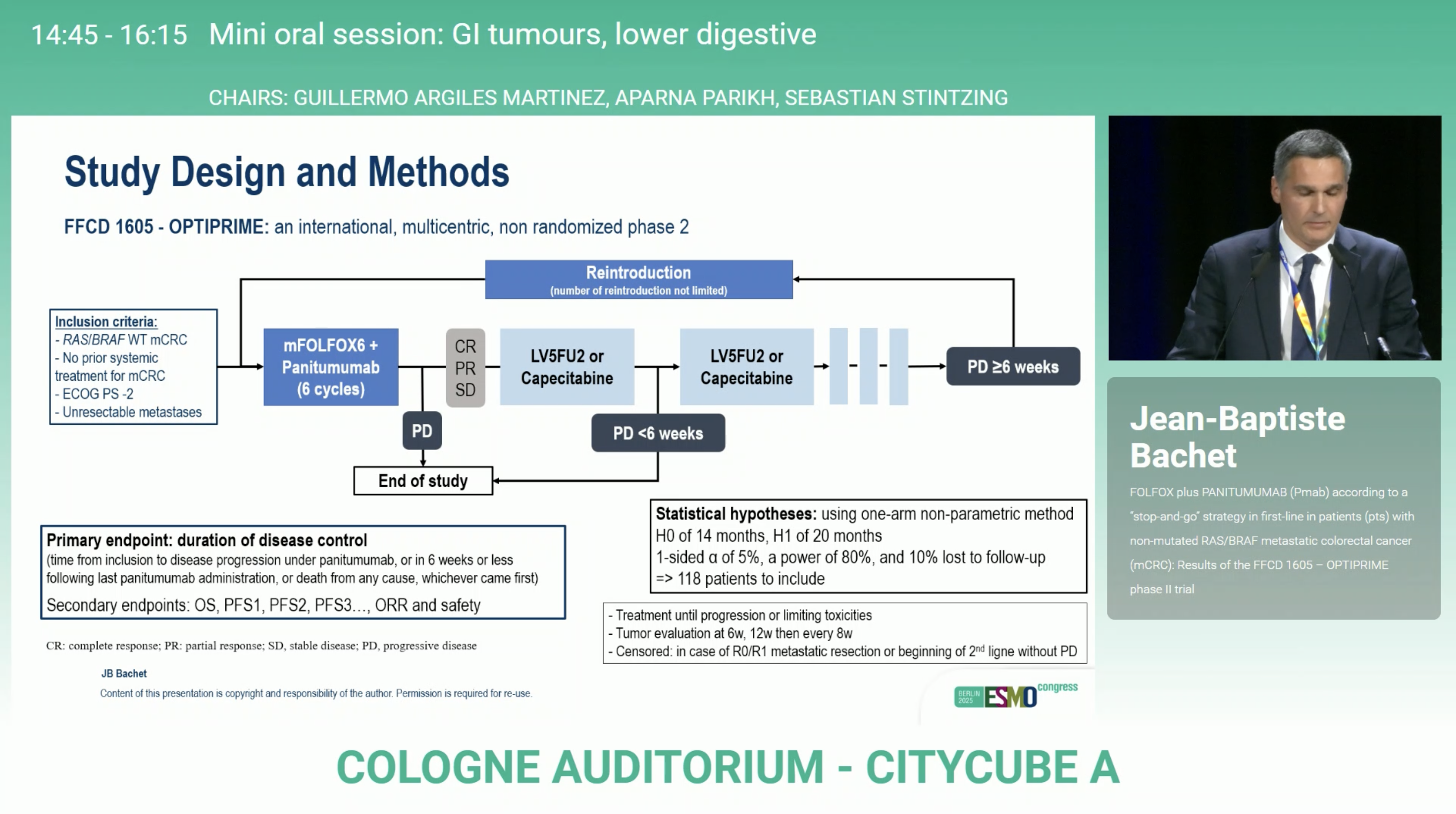 At the ESMO Congress 2025 in Berlin, Dr. Jean-Baptiste Bachet (Paris, France) presented the final results of the phase II OPTIPRIME trial (Abstract 727MO), a multicentre French study evaluating a novel “stop-and-go” strategy combining FOLFOX and panitumumab (Pmab) in patients with RAS/BRAF wild-type metastatic colorectal cancer (mCRC).