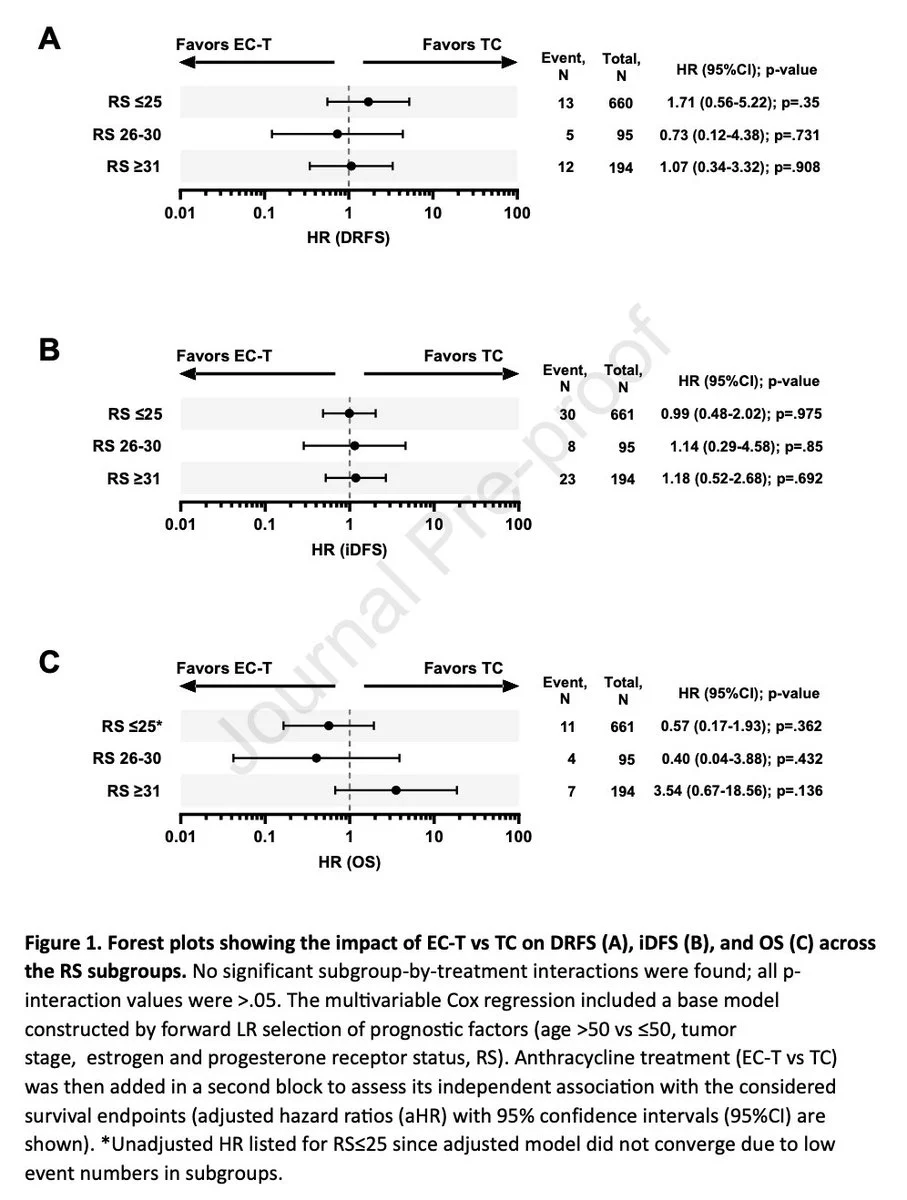 This analysis comparing EC-T vs TC across Oncotype DX RS subgroups shows no significant benefit of adding anthracyclines for DRFS, iDFS, or OS, regardless of RS (≤25, 26–30, ≥31).