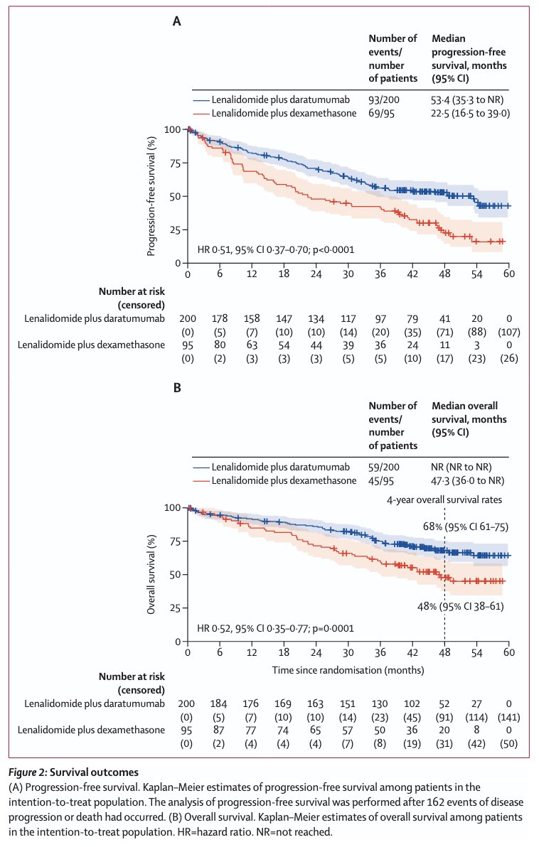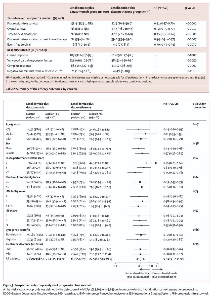 IFM2017-03 trial of Revlimid/Darzalex with 2 cycles of dex versus triplet with continuous dex finds DRAMATICALLY reduced progression risk (53.4 mos (95% CI 35.3-not reached) vs. 22.5 mos (HR 0.51, 95% CI 0.37-0.70, p<0.0001)).”