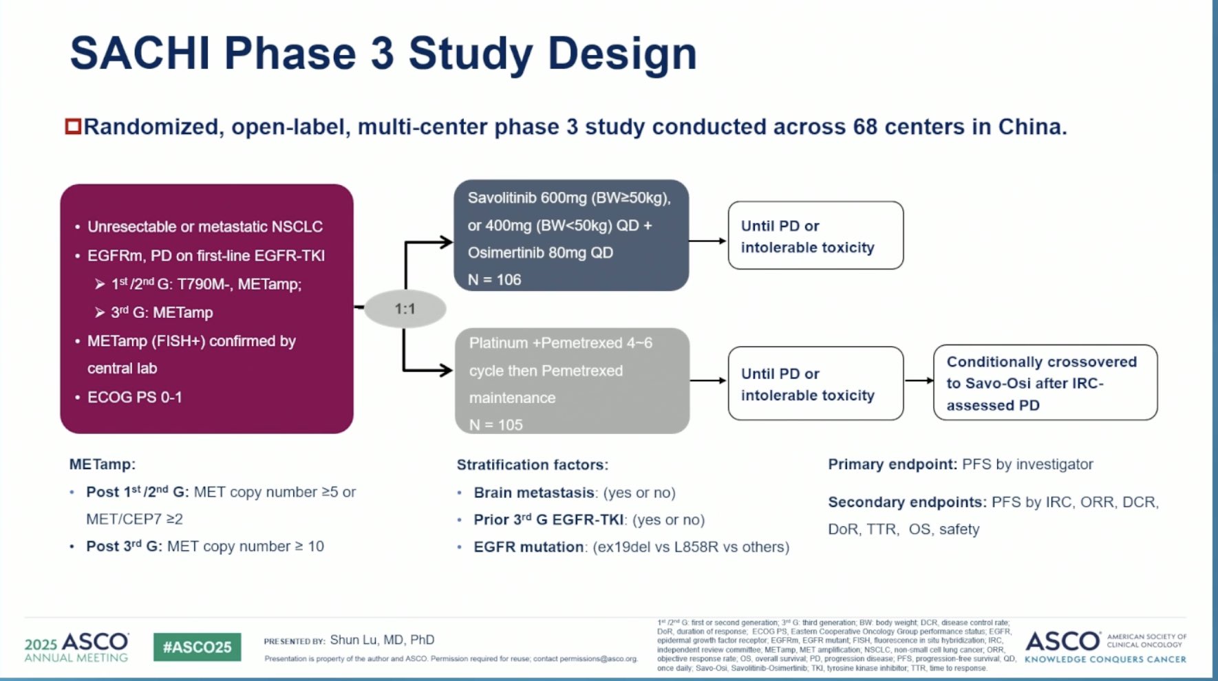 ” Phase 3 SACHI study savolitinib plus osi vs. SoC ChT in METamp/TKI-resistant EGFRm aNSCLC (China): mPFS ITT 8.2 mo vs 4.5 (HR 0.34). PFS benefit regardless of prior TKI-generation. ORR 58 vs 34%. Quite consistent with SAVANNAH’s phase 2 trial (ELCC2025) ORR 56%, mPFS 7.4 mo) “