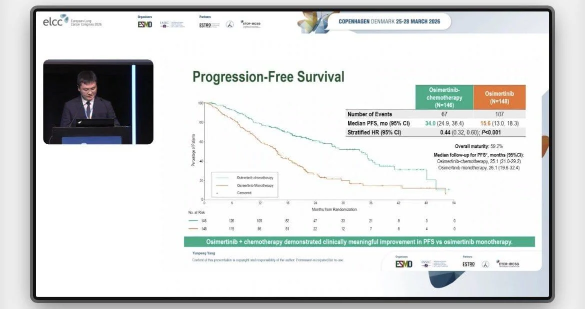 Median progression-free survival was 34.0 months in the combination arm compared to 15.6 months with osimertinib alone, corresponding to a hazard ratio of 0.44 (95% CI 0.32–0.61; p<0.001). This translates into a 56% reduction in the risk of disease progression or death, representing a clinically meaningful benefit in this high-risk population.