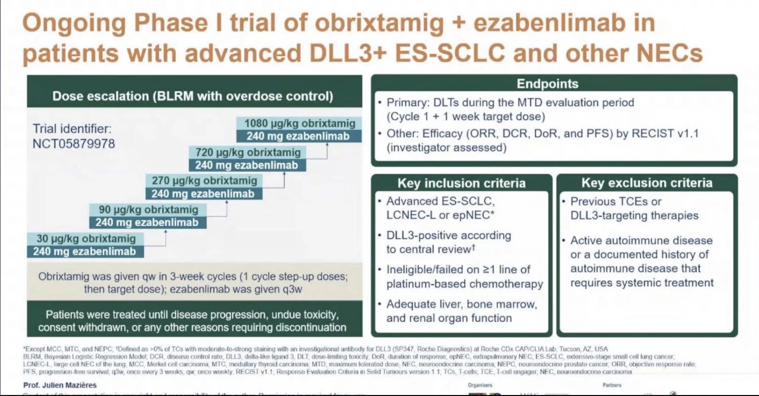 Obrixtamig is an IgG-like bispecific T-cell engager that simultaneously binds DLL3 on tumor cells and CD3 on T cells, promoting targeted immune-mediated tumor cell killing. Preclinical data suggest that this approach can also upregulate PD-1 and PD-L1 expression, potentially creating an adaptive resistance mechanism.