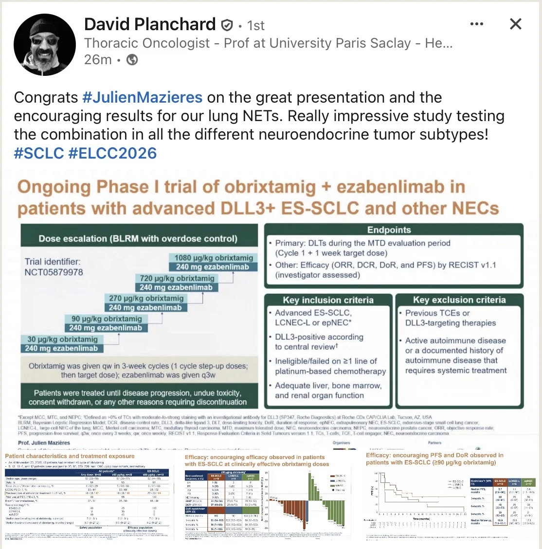 DLL3 is highly expressed on the surface of neuroendocrine tumors, including SCLC, making it an attractive therapeutic target. At the European Lung Cancer Congress 2026, early-phase data from a dose-escalation trial further evaluated this combination strategy in patients with advanced DLL3-positive
