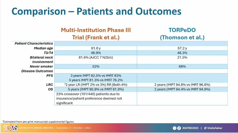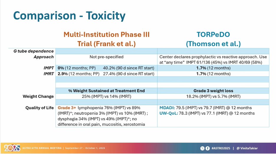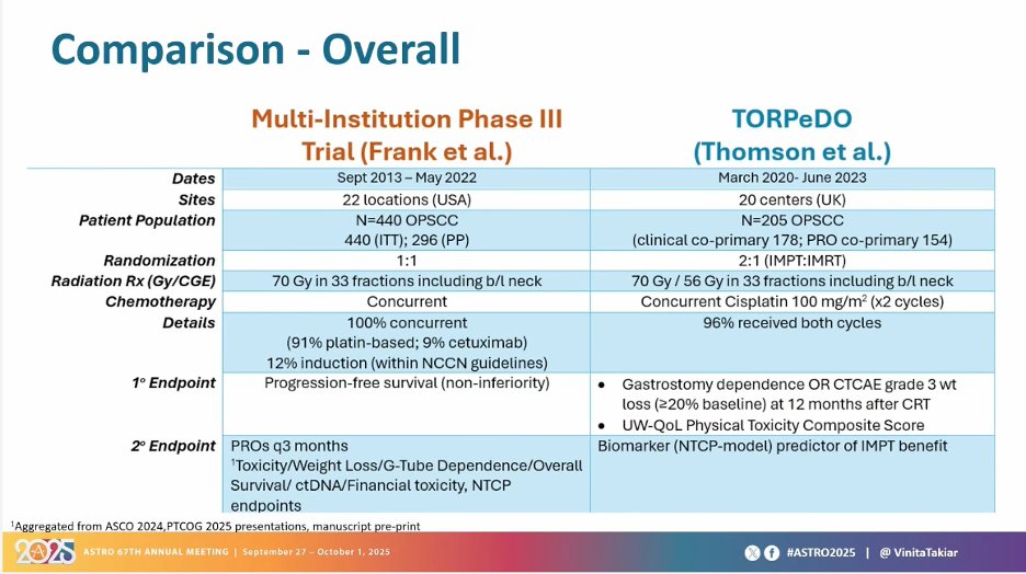 “Data from Ph3 RCT of TORPEdO trial looking at photon vs proton RT for patients with LA-OPSCC receiving chemoRT showed NO benefit in feeding-tube dependence, other HRQoL, LRC, and survival.