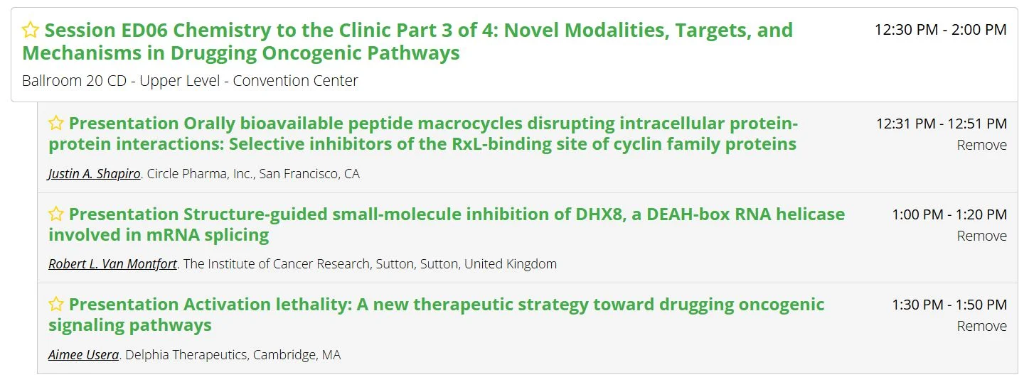 The selection becomes more challenging! However, the Chemistry to the Clinic series of educational sessions – organized by the Chemistry in Cancer Research Working Group of American Association for Cancer Research – are Do-Never-Miss sessions. I am especially looking forward to part 3 which is focusing on innovative ways of drugging oncogenic pathways. We will learn more about Circle Pharma’s macrocyclic cyclin A/B inhibitors, about Delphia Therapeutics’ approach to kill cancer cells by overactivation of oncogenic pathways. And Rob Van Montfort will disclose work on a novel way to modulate splicing which was pursued in a collaboration between The Institute of Cancer Research & Merck Group.