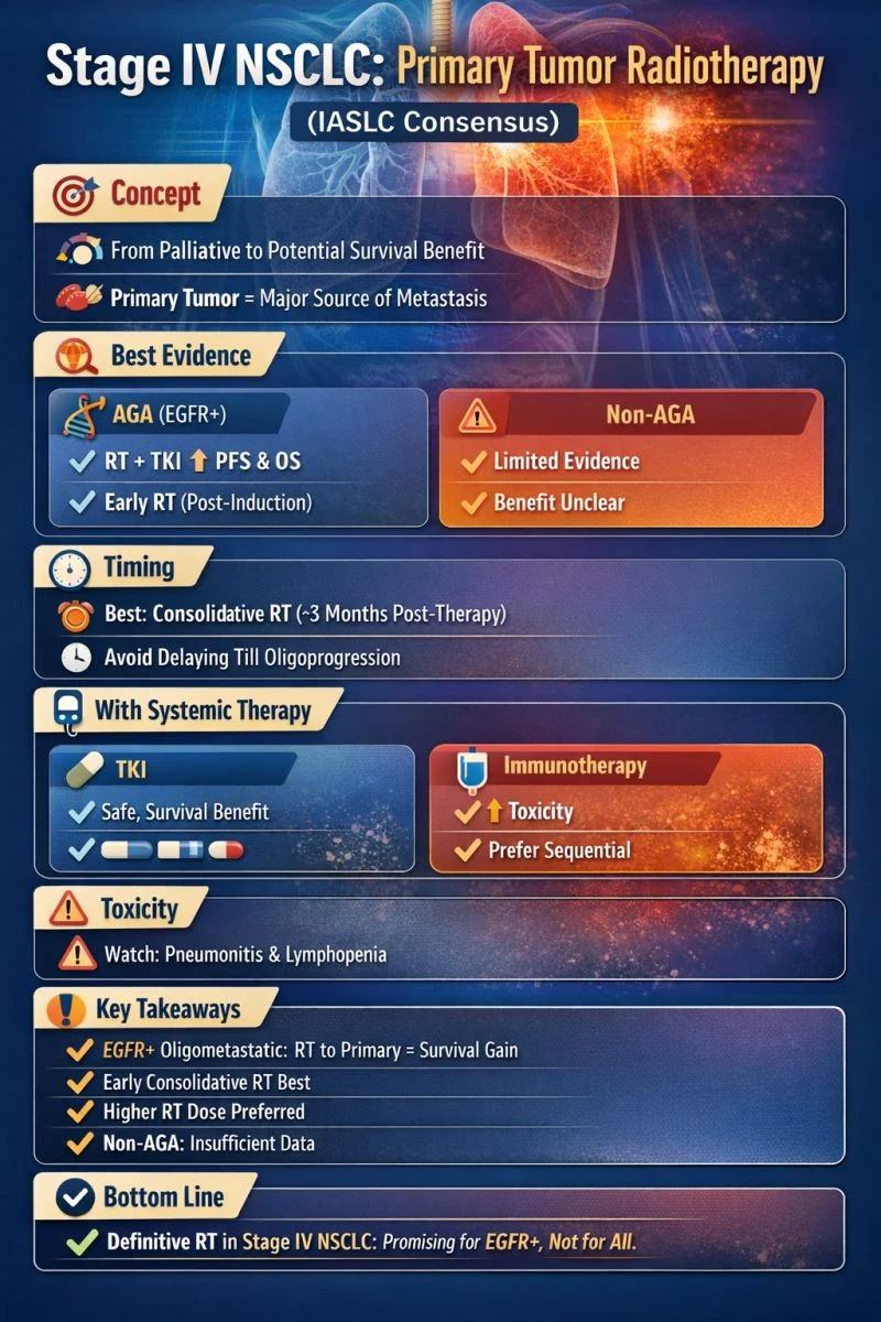 Now, emerging evidence and IASLC consensus signal a paradigm shift: Definitive RT to the primary tumor is becoming a standard component in selected Stage IV patients