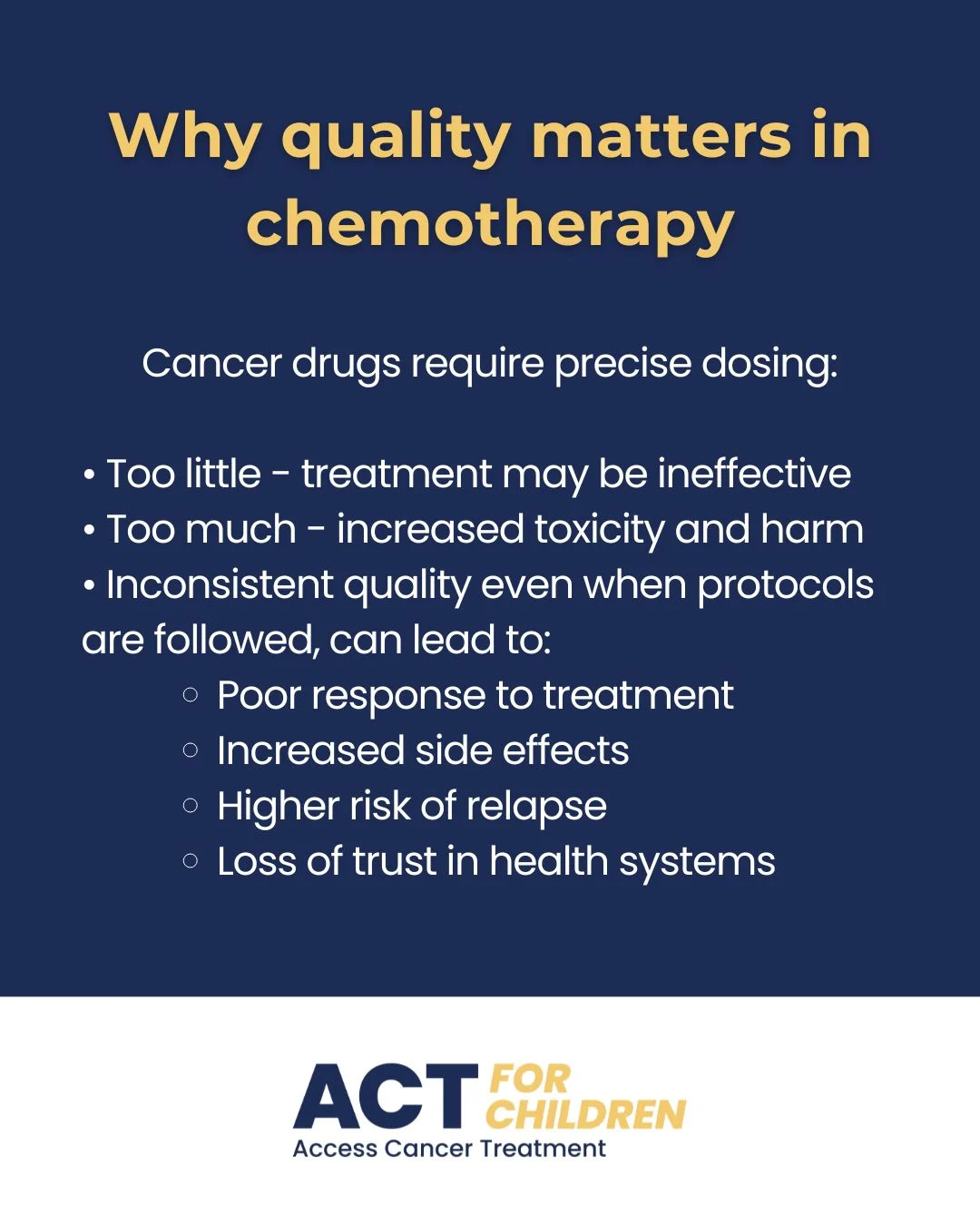 In laboratory testing across multiple countries, a significant share of chemotherapy drugs were found to contain too little or too much of the active ingredient. For children with cancer, the standard of care depends not only on availability, but on medicines working exactly as intended every time.