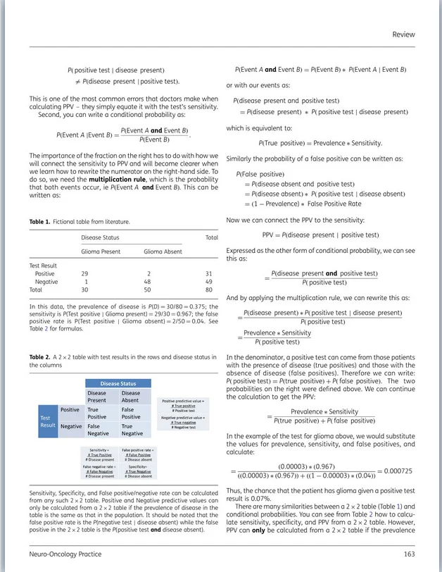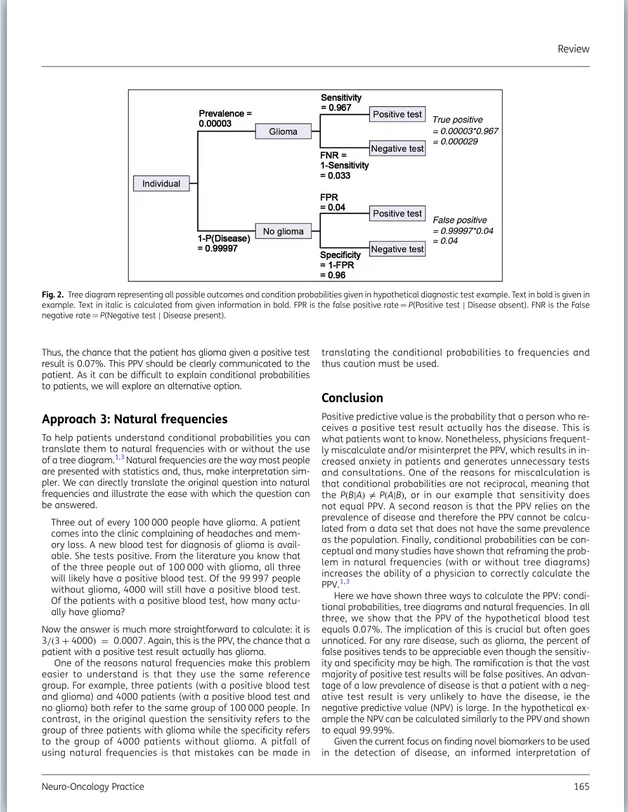 For example, consider a blood test for glioma (0.003% prevalence) with 96.7% sensitivity and a 4% false-positive rate.