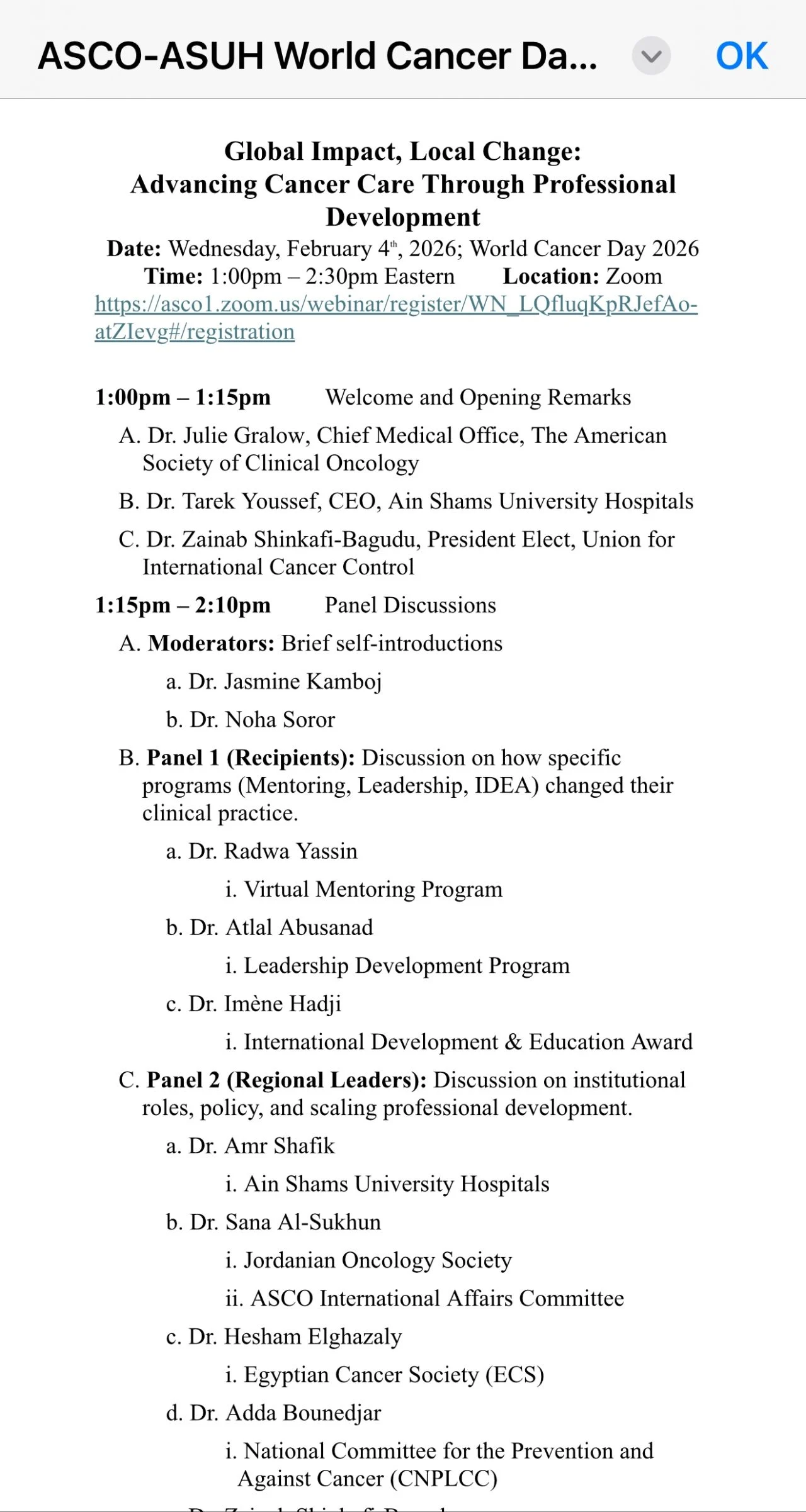 Feb 4, 2026, I am honored to join my dear friend Noha Soror to moderate the webinar hosted by American Society of Clinical Oncology (ASCO) and Ain Shams University – ‘Advancing Cancer Care through Professional Development.’