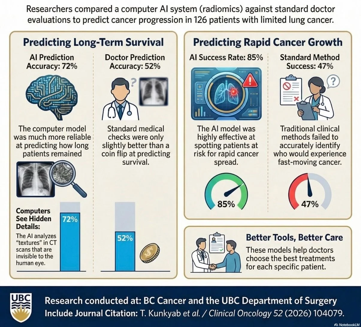 In this study from colleagues at BC Cancer and UBC, radiomics-based AI analyzed subtle imaging patterns in CT scans and predicted lung cancer progression and survival more accurately than traditional clinical assessment.