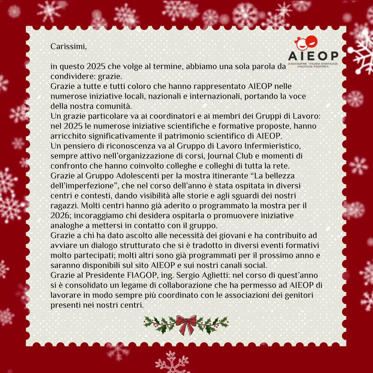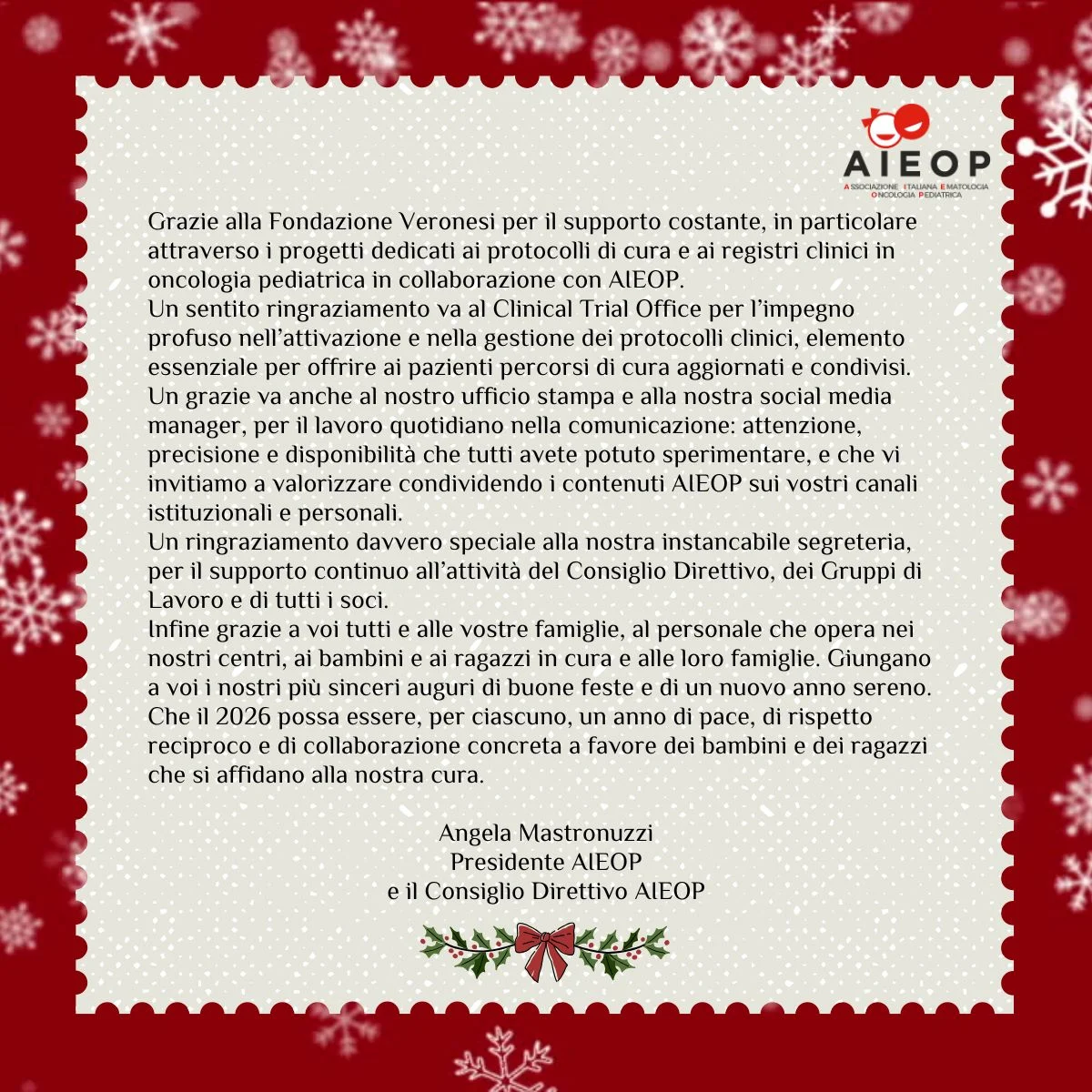 We also thank our press office and our social media manager for their daily commitment to communication, demonstrated through care, precision, and availability. We invite you to support this work by sharing AIEOP content on your institutional and personal channels.