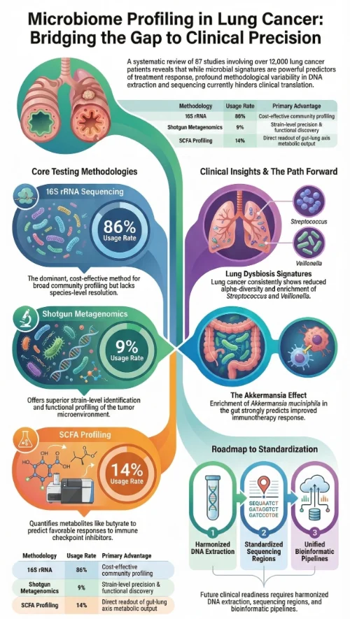 Our systematic review evaluates the methodological landscape of microbiome testing in lung cancer, focusing on sequencing-based approaches and metabolomic profiling.