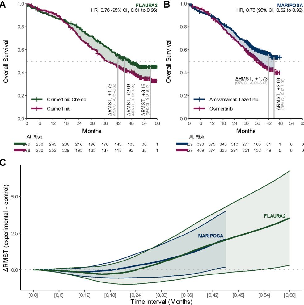 Our RMST-based reanalysis, led by Fabian Acker revisits FLAURA2 and MARIPOSA, showing that:
