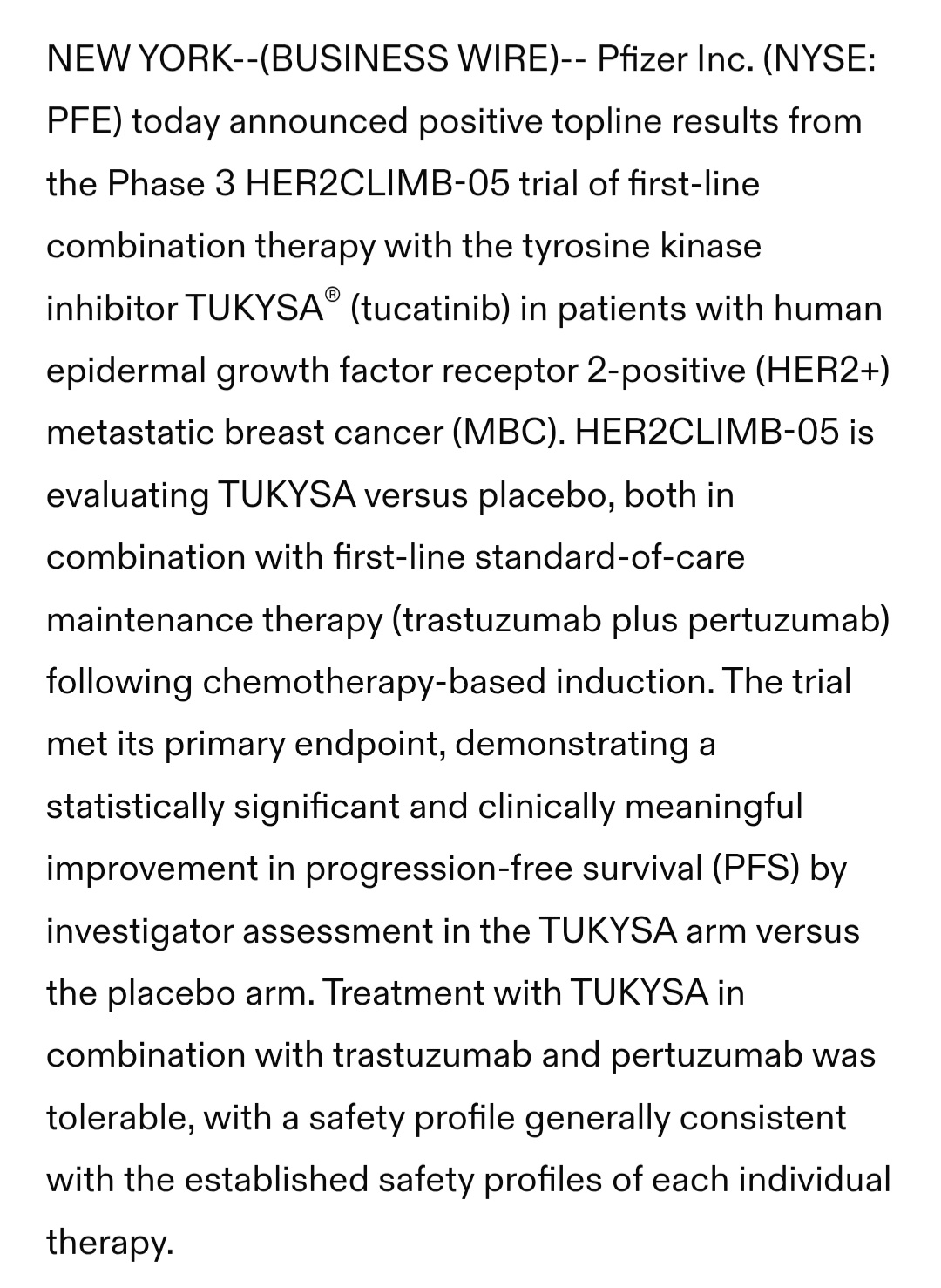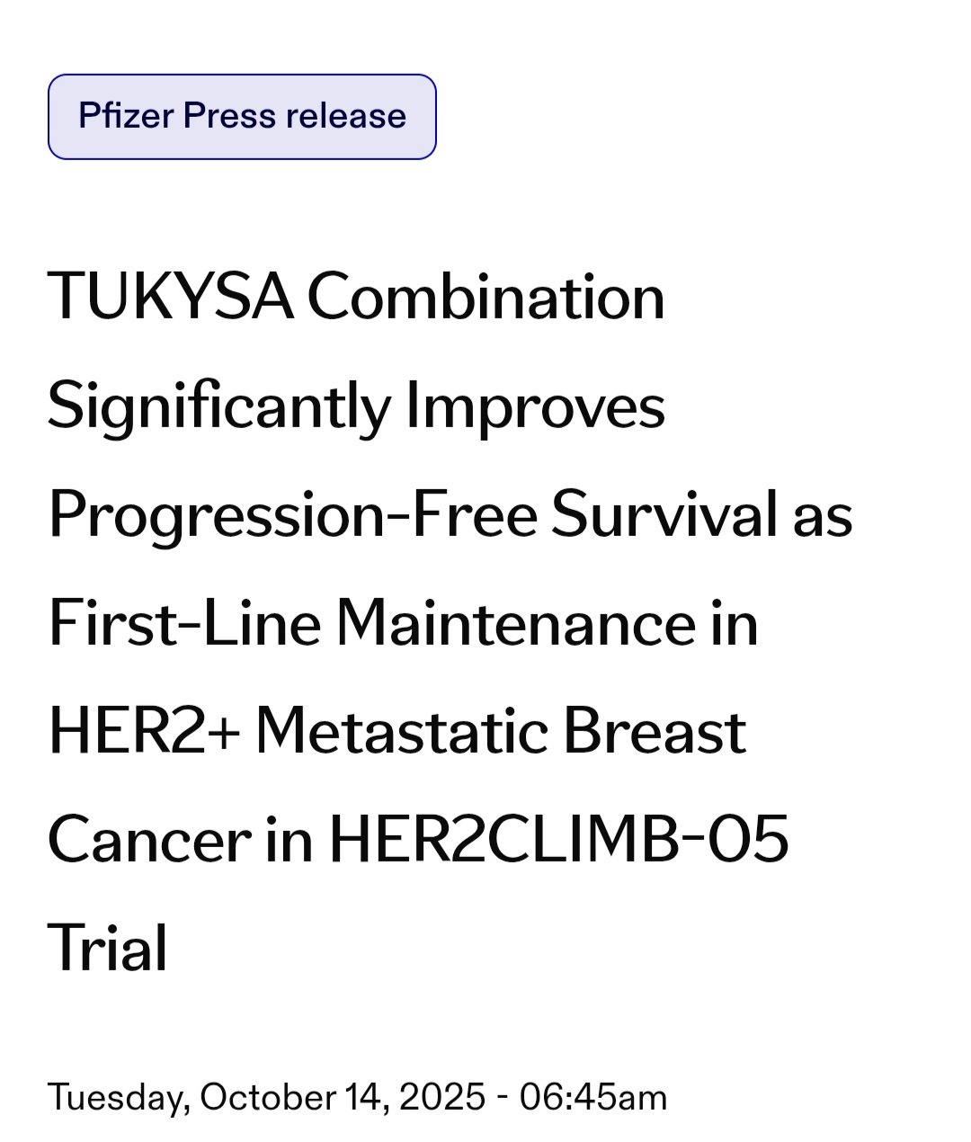 Pfizer reports positive Phase 3 results — adding TUKYSA (tucatinib) to trastuzumab plus pertuzumab maintenance significantly improves PFS in first-line HER2 positive metastatic breast cancer.
