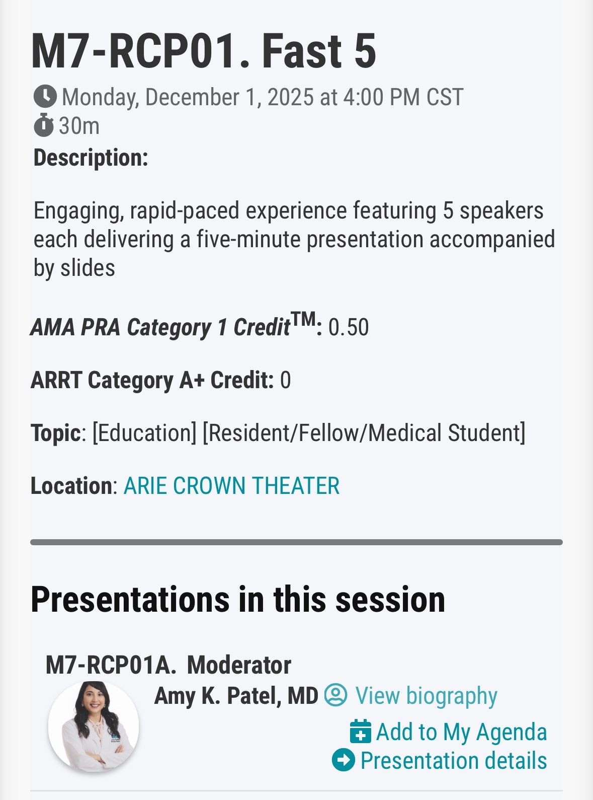 “For those attending The Radiological Society of North America (RSNA) Annual Meeting soon, please don’t forget to mark your calendars for what is sure to be a dynamic FAST 5 Session with incredible topics and speakers. Come listen to what’s cutting-edge and perhaps a different take on what we perceive as the “norm” for hashtag#radiology. We hope to see you there.”