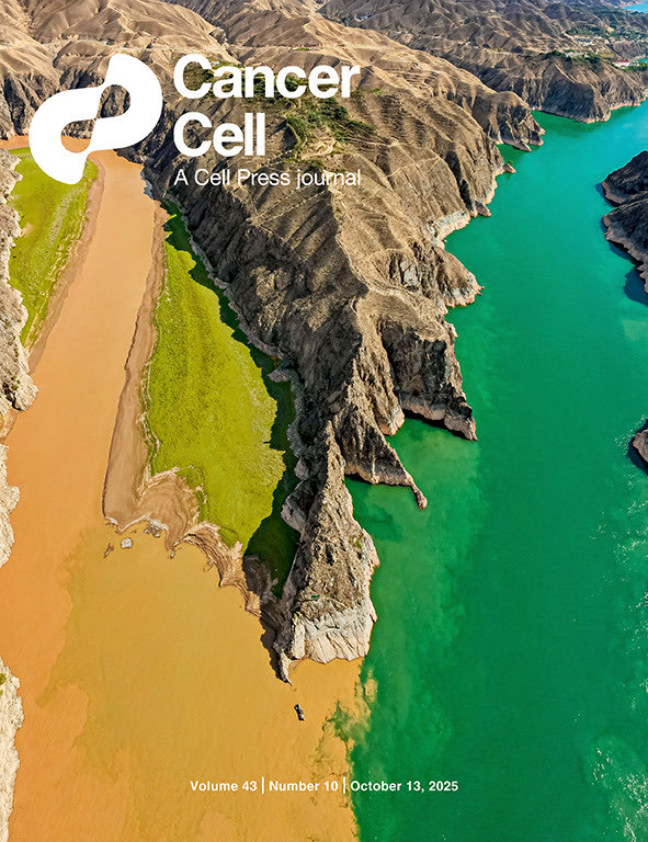 “Striking cover of Cancer Cell showcasing the dramatic meeting of the Tao River and the Yellow River in Gansu Province, China. The cover signifies the efficacy of combining aPD-1 and aCTLA-4 in patients with locally advanced MSI-H/dMMR.”