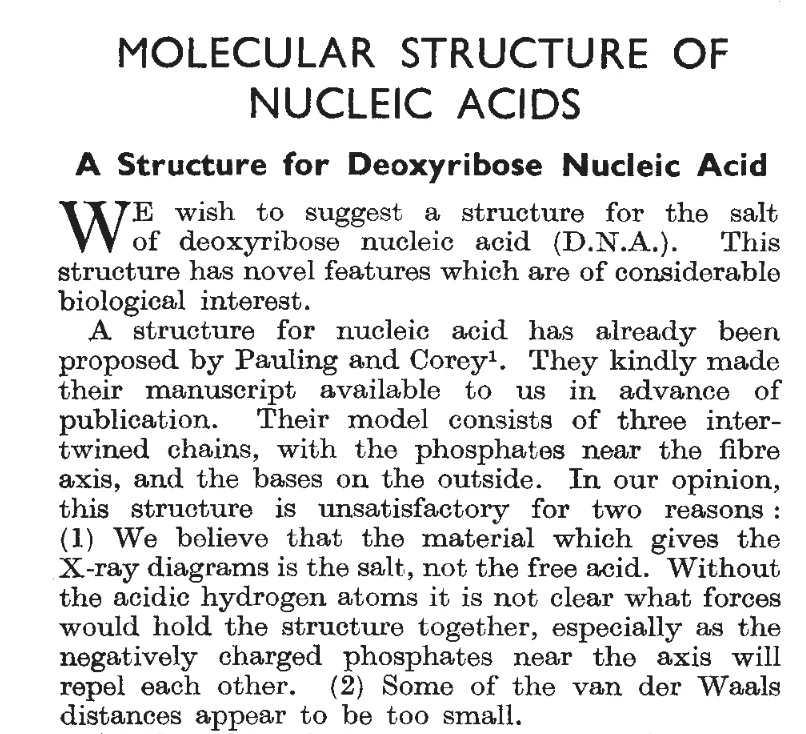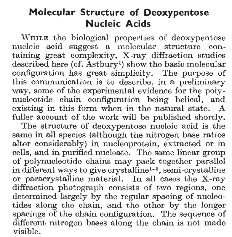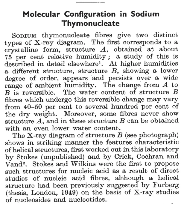 Commemorating the simultaneous publication today in Nature of 3 companion papers on the structure of DNA, including the famous ‘Structure B’ photo-radiograph by Rosalind Franklin.”
