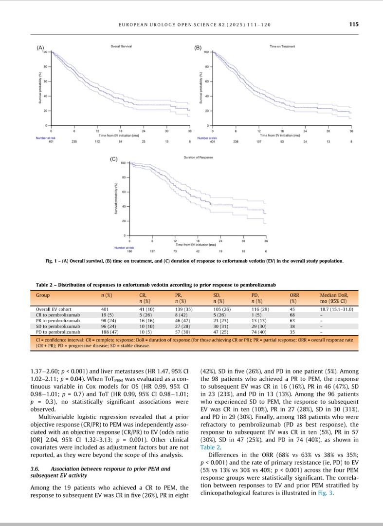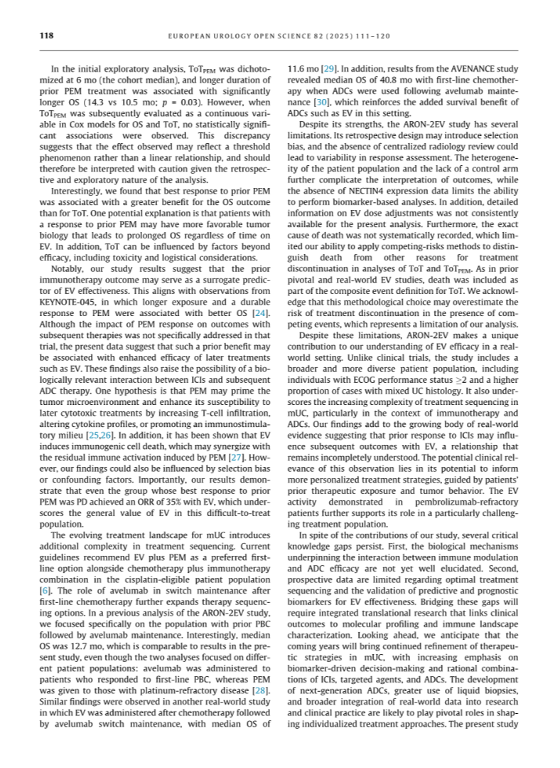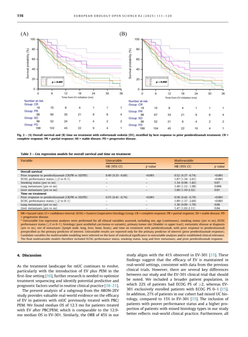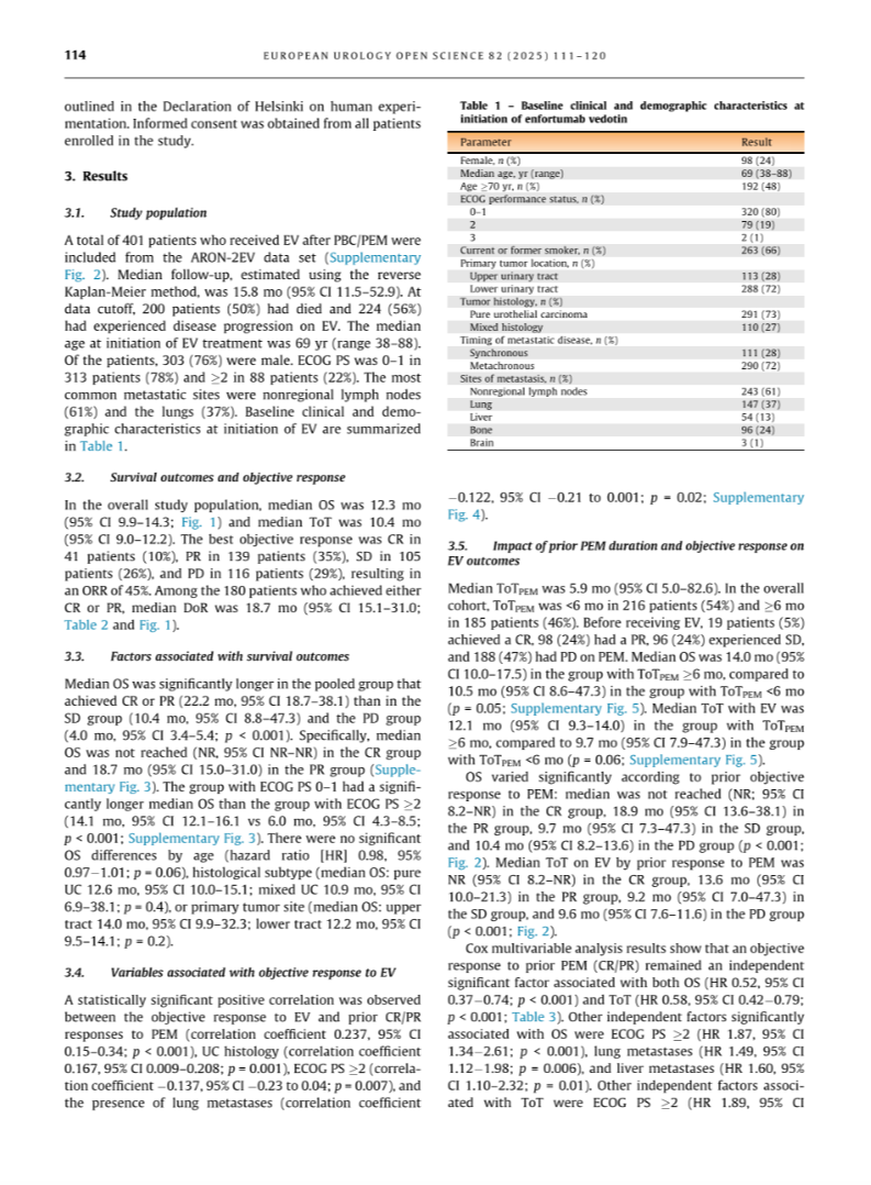 ARON-2EV is an international, multicentre, retrospective study examining the real world use of Enfortumab Vedotin (EV) in patients with mUC. The World’s Largest Dataset of its kind included 401 patients treated with EV following PBC (Platinum Based Chemotherapy)/PEM (Pembrolizumab). Median OS was 12.3 mo (95% confidence interval [CI] 9.9–14.3), median ToT was 10.4 mo (95% CI 9.0–12.2), and the ORR was 45%. Subgroup Analysis of progressive disease (PD) on prior PEM yielded 35% ORR. Implicates association between prior PEM outcomes and subsequent EV efficacy.
