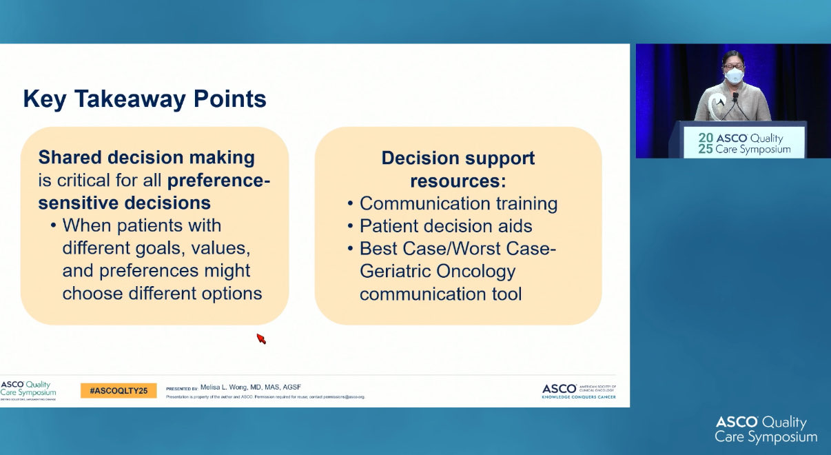 “Dr. Melisa Wong shares the intricacies of shared decision making and her work on the ‘Best Case/Worst Case’ geriatric oncology communication tool in our ASCOQLTY25 session Partners in Care: Building Bridges through Shared Decisions”