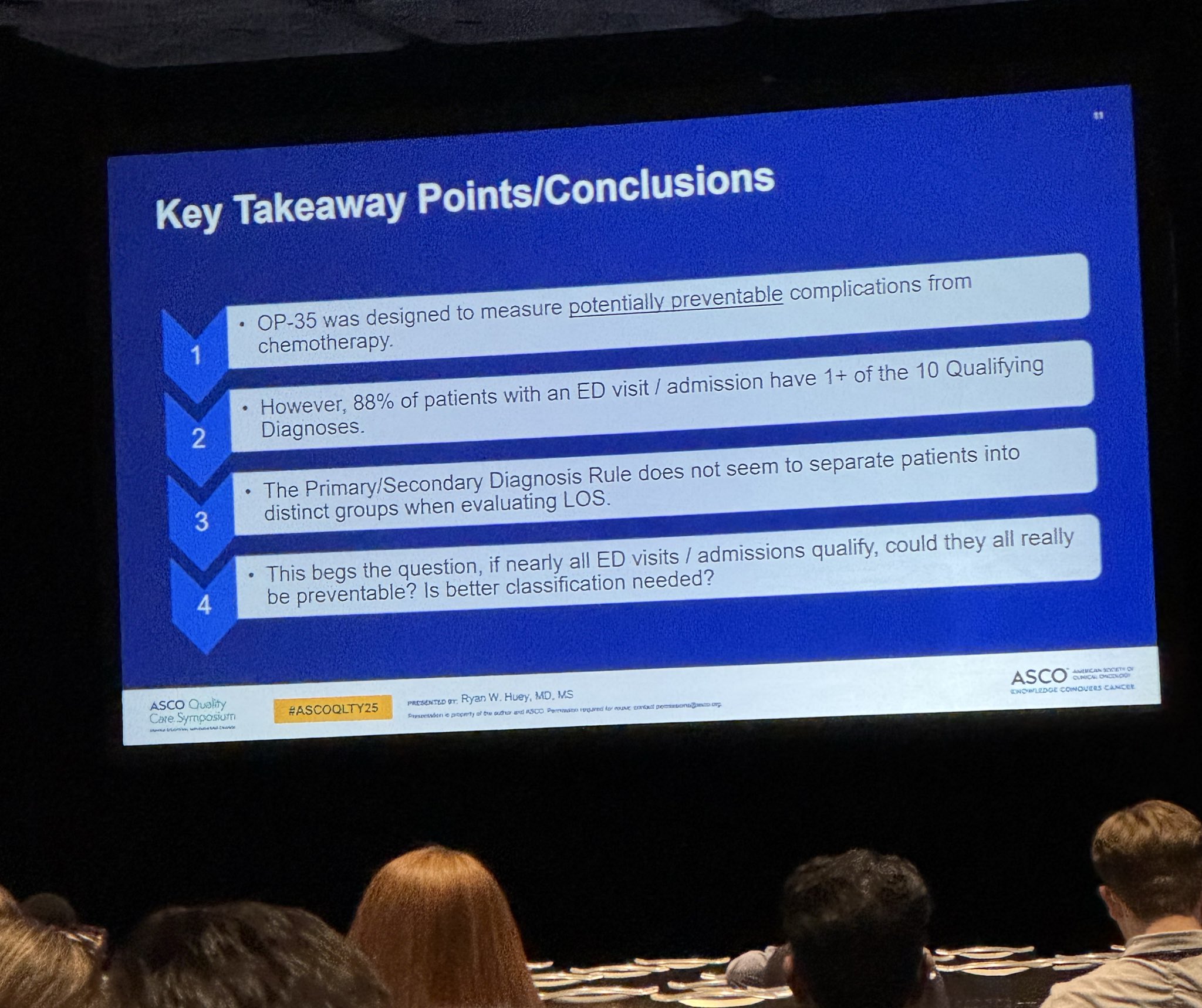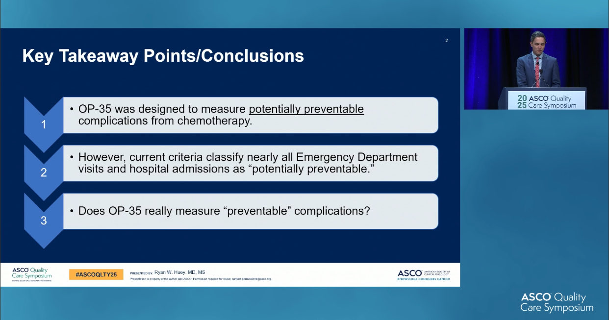 “Dr. Ryan Huey, takes the stage at ASCOQLTY25 CMS’s OP-35 quality measure, designed to flag potentially preventable chemo complications, is sensitive BUT not specific.