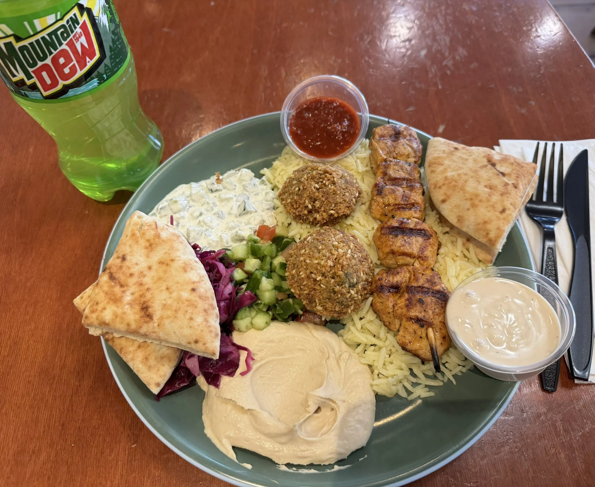“Love the chicken, falafel and tahini at this Mediterranean restaurant across the street from the Moscone Convention Center GI26 the Mountain Dew is a bonus.”