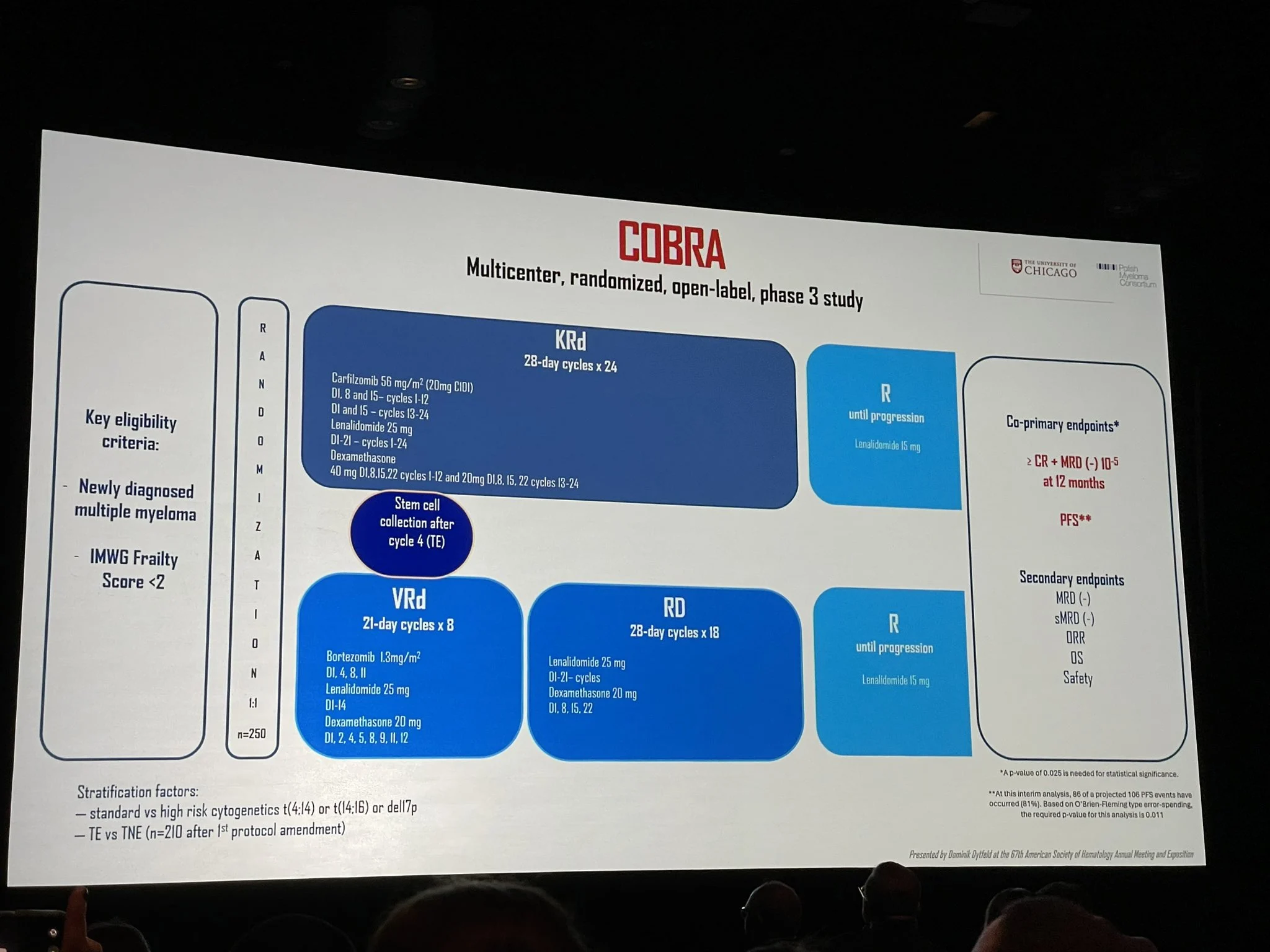 “COBRA = big challenge to ENDURANCE, but no firm answers on KRd vs VRd since PI exposure different. Nevertheless – authors for clearly showing that K 56 1x weekly carries a punch and is manageable! Although no PFS ∆ in ASCT-ineligible, so mainly for younger pts (?).”