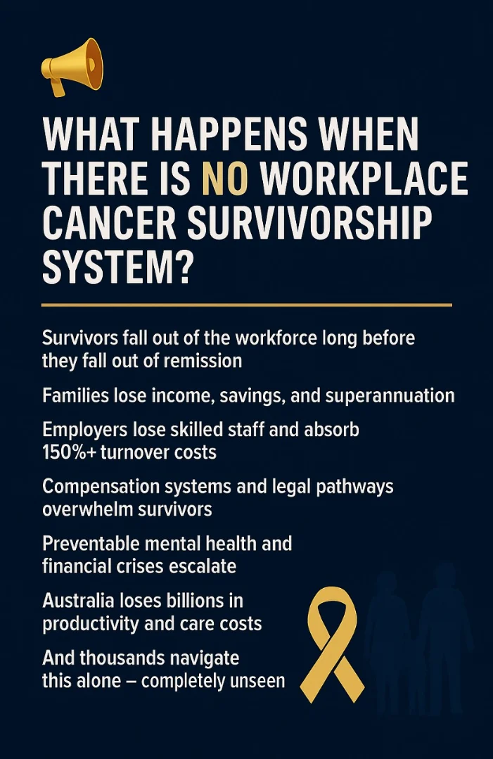 Survivors face quiet discrimination, stalled careers, job loss, little accommodation, and severe financial toxicity. Up to 90 % want to return to work – many can’t. - Australia has no visibility