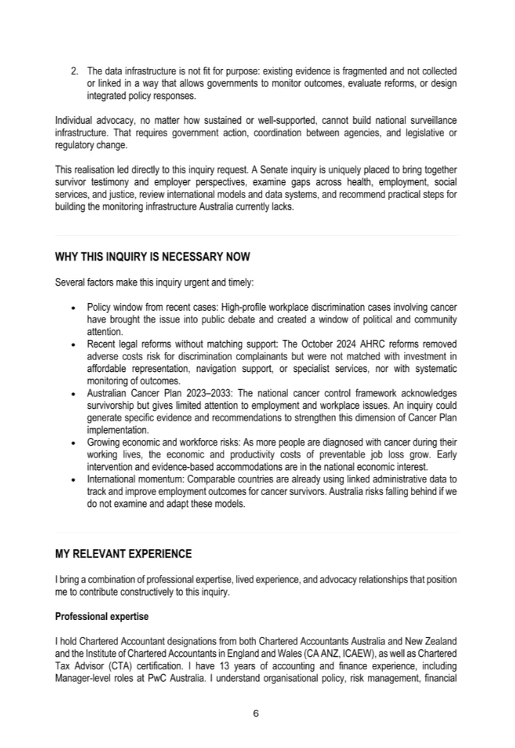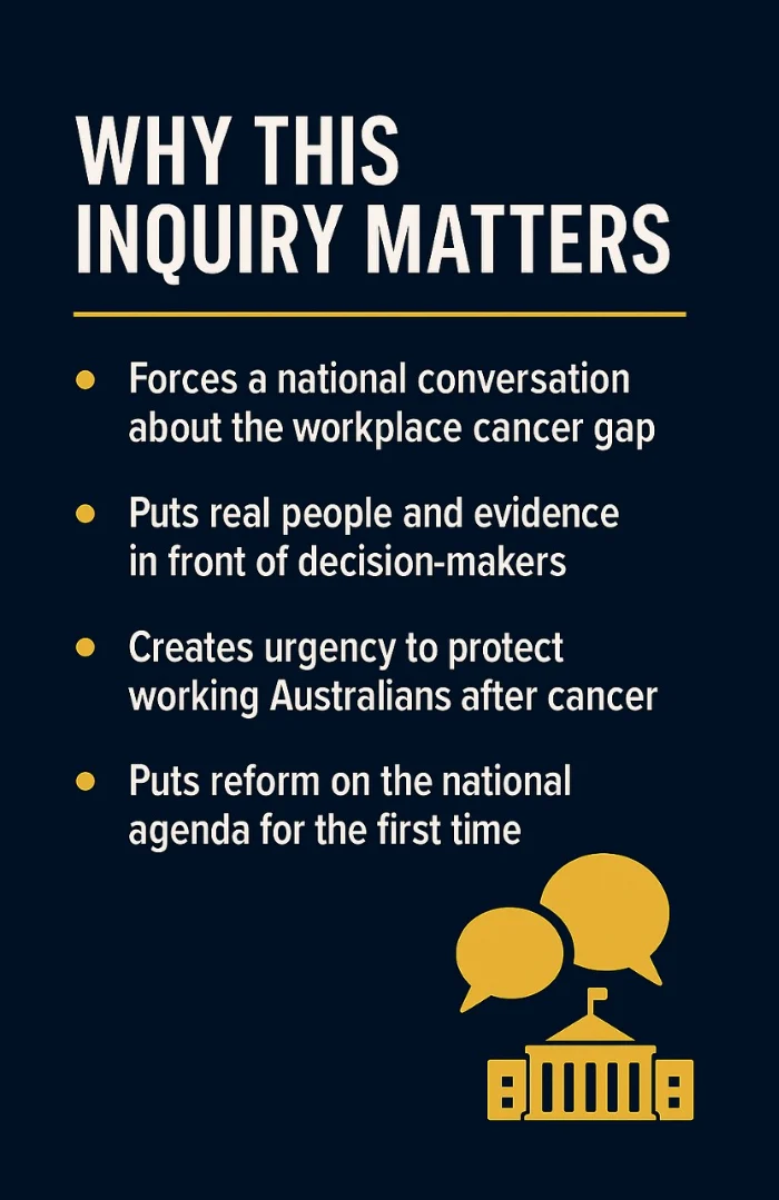This inquiry is the most powerful path we have right now to give the ~68,000 Australians diagnosed with cancer each year a fair chance to keep their job, dignity, and financial future after cancer.