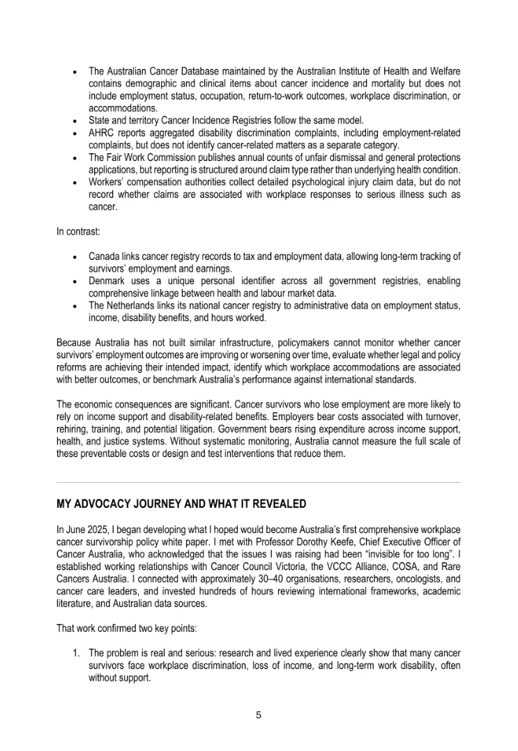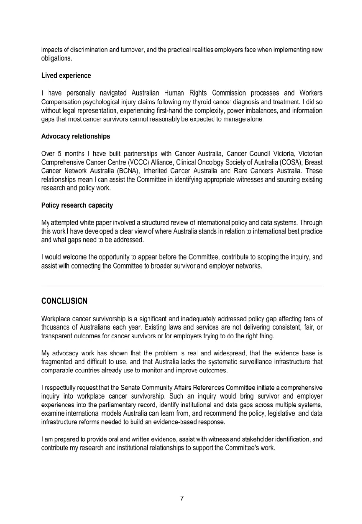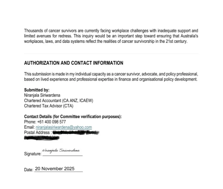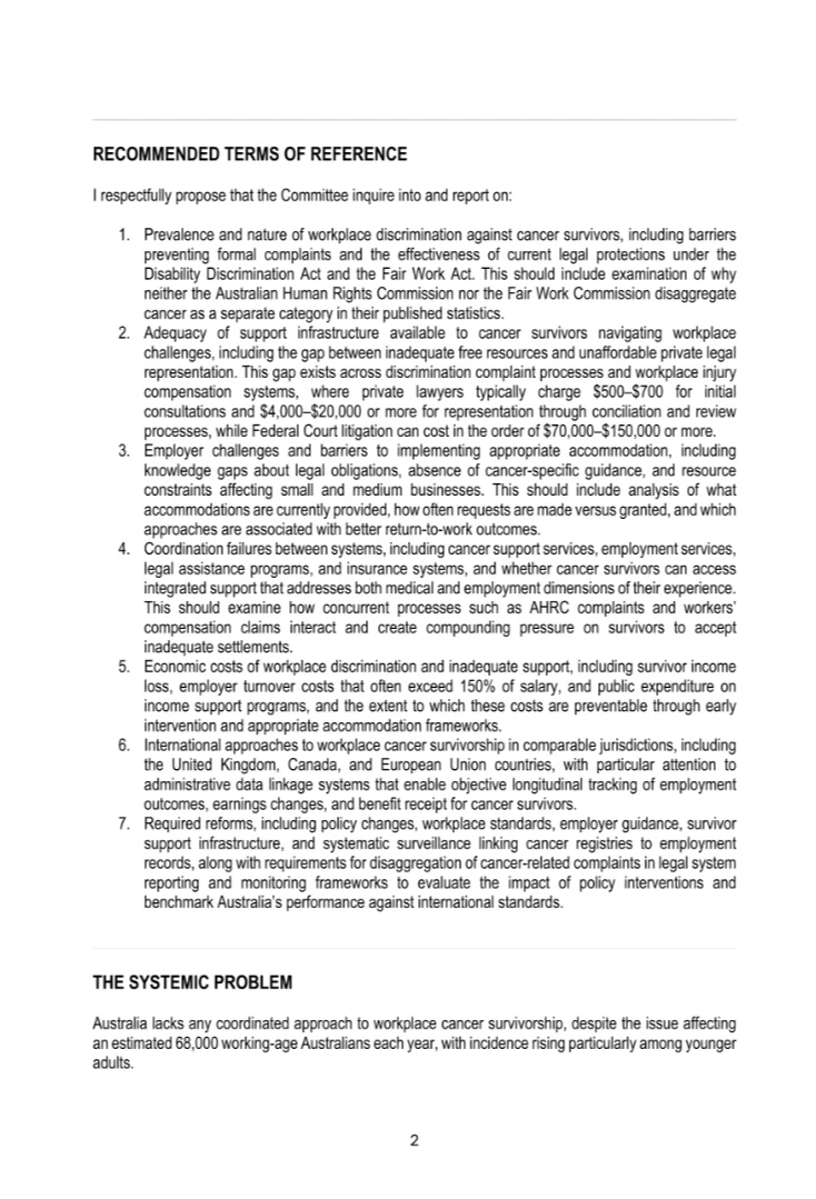 On 20 November 2025, after five months of advocacy and research, I formally submitted a request to the Senate Community Affairs References Committee for a national inquiry into workplace cancer survivorship.