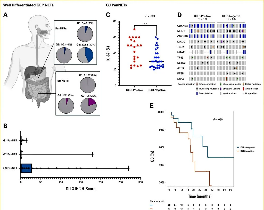 DLL3 expression is markedly enriched in G3 PanNETs and GEP-NECs, tightly linked to higher Ki-67 and inferior outcomes — defining a distinct, targetable phenotype.