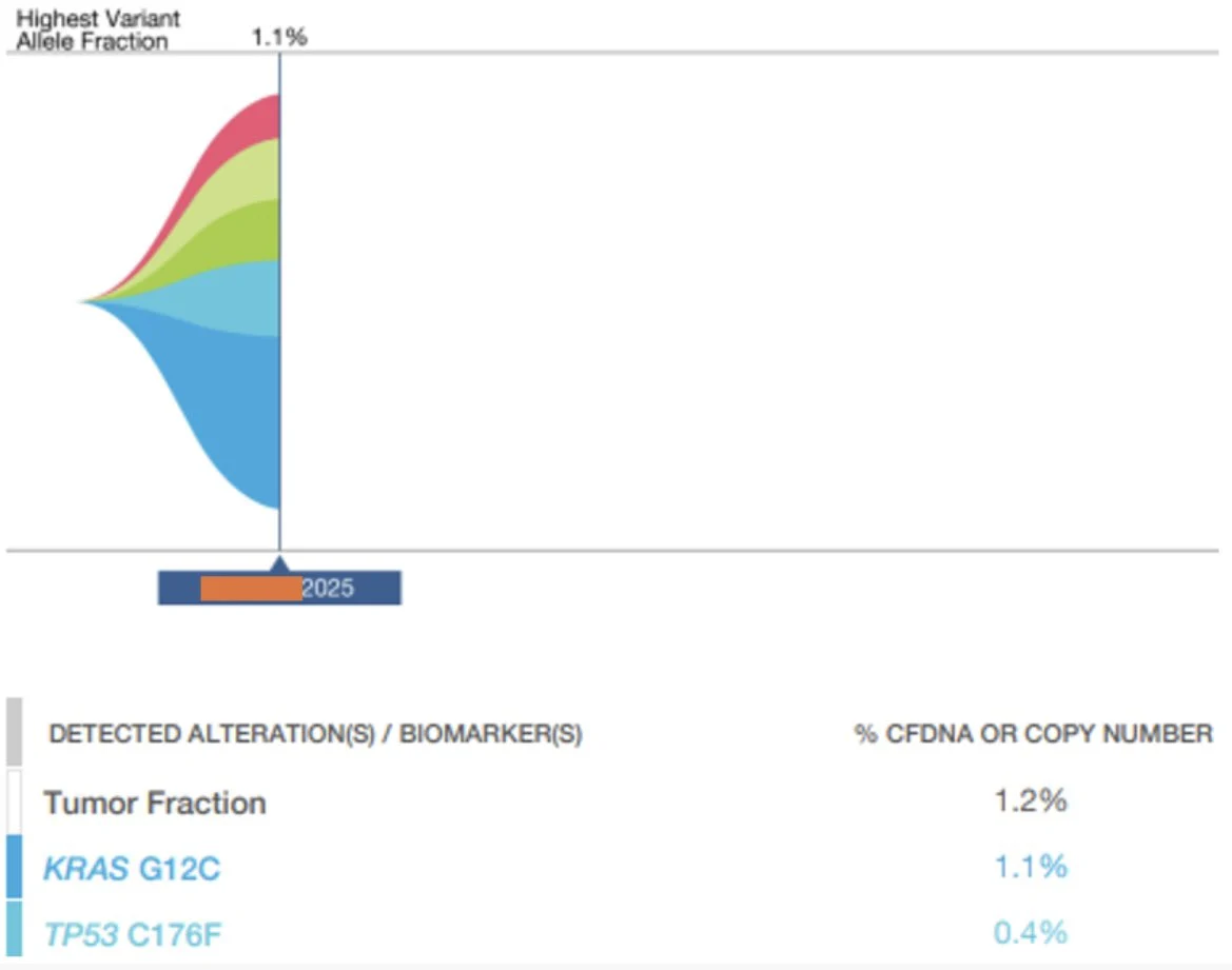 Cardiac MR and ECHO confirm a mobile mass in L atrium contiguous w LUL mass. Path shows lung adenoca, PD-L1 TPS score >90%, ctDNA+ for K-Ras G12C.