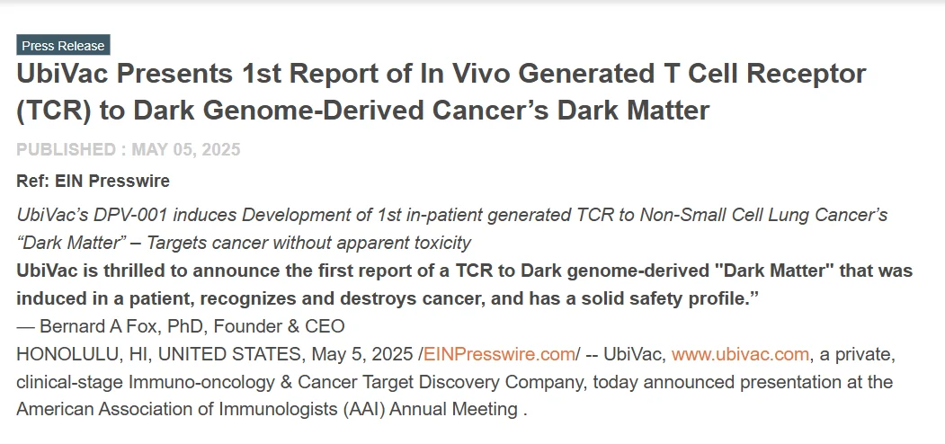 UbiVac Presents 1st Report of In Vivo Generated T Cell Receptor (TCR) to Dark Genome-Derived Cancer’s Dark Matter