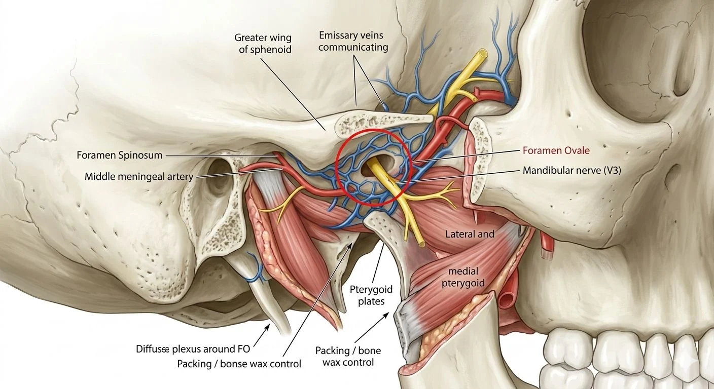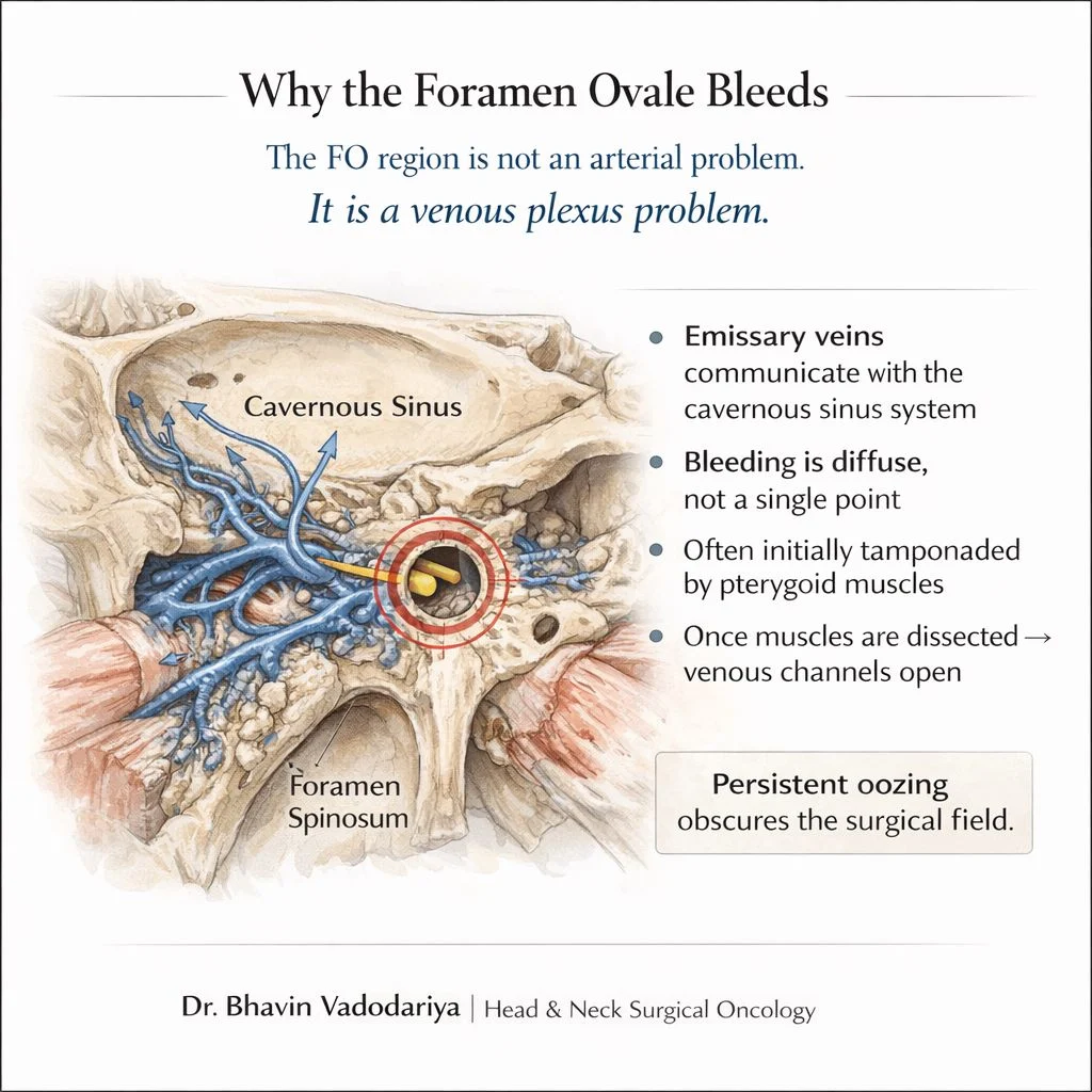 Often the bleeding is temporarily tamponaded by medial and lateral pterygoid muscles, but once these are dissected to achieve oncologic clearance, venous channels open.