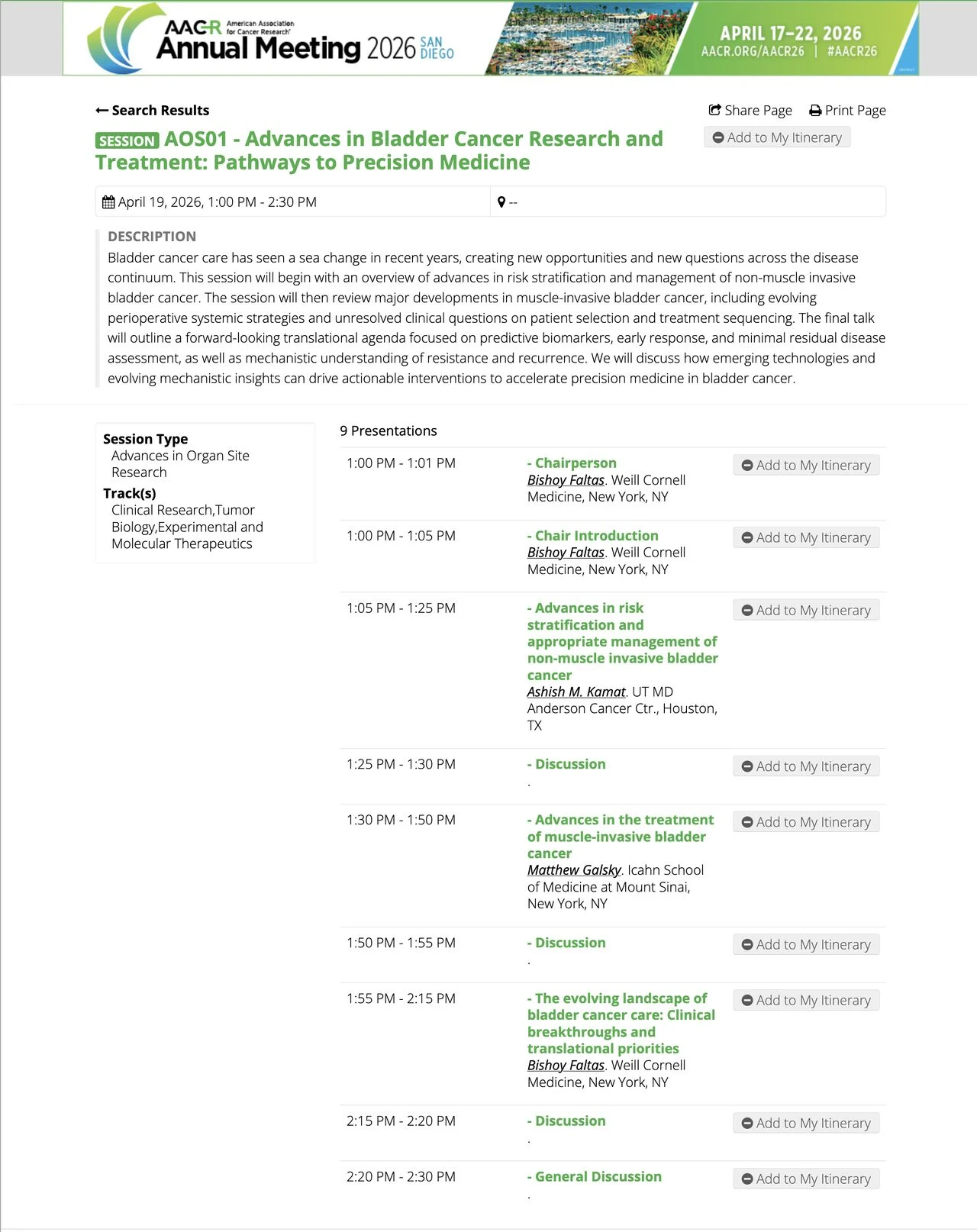 “Bladder cancer care has undergone a sea change in recent years, creating new opportunities and new questions across the disease continuum. I am looking forward to chairing this session at AACR26: Advances in Bladder Cancer Research and Treatment: Pathways to Precision Medicine