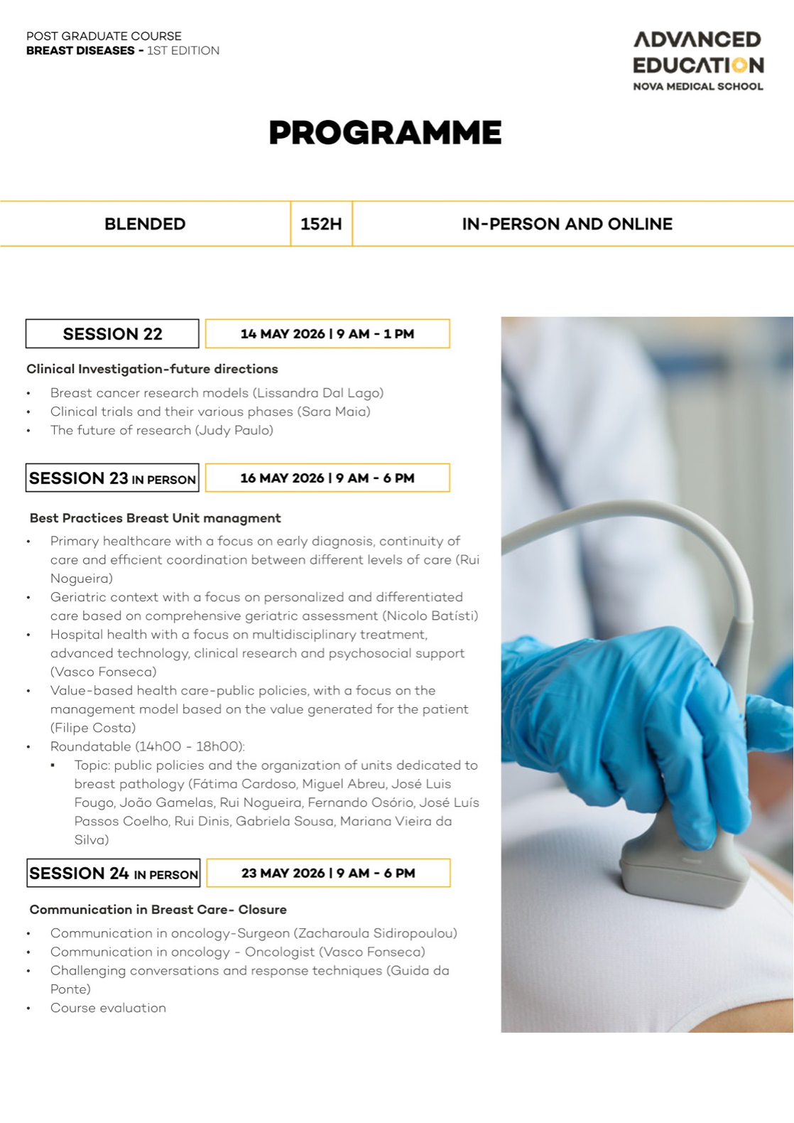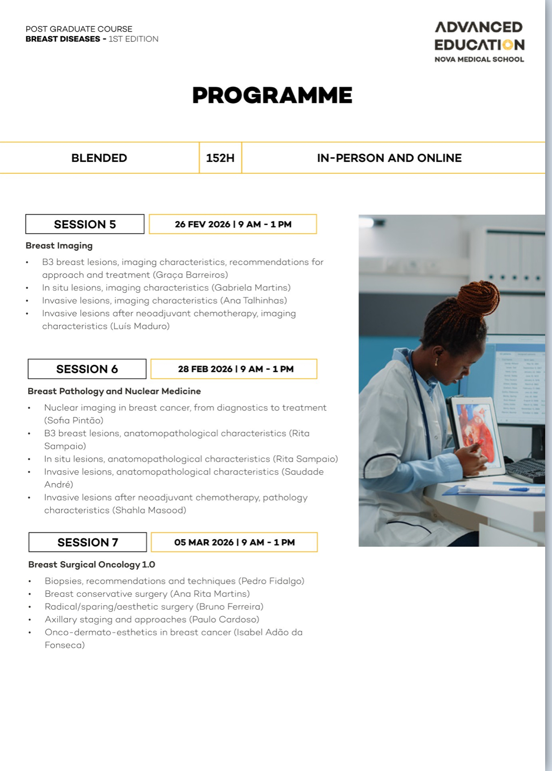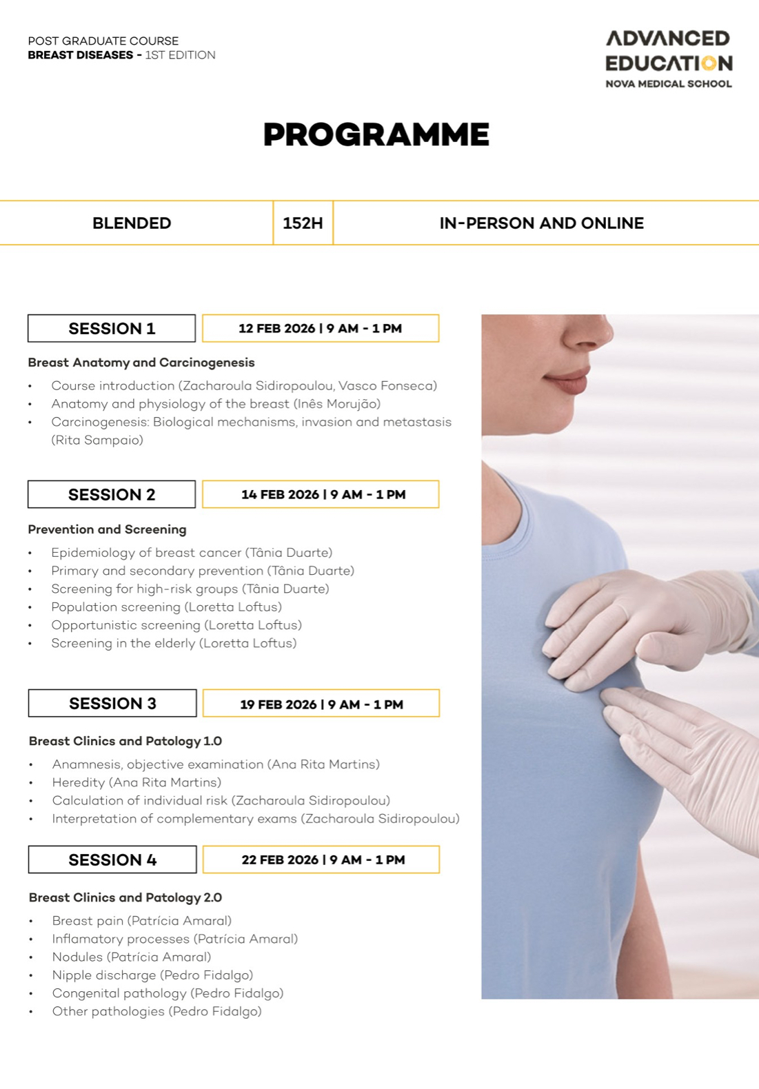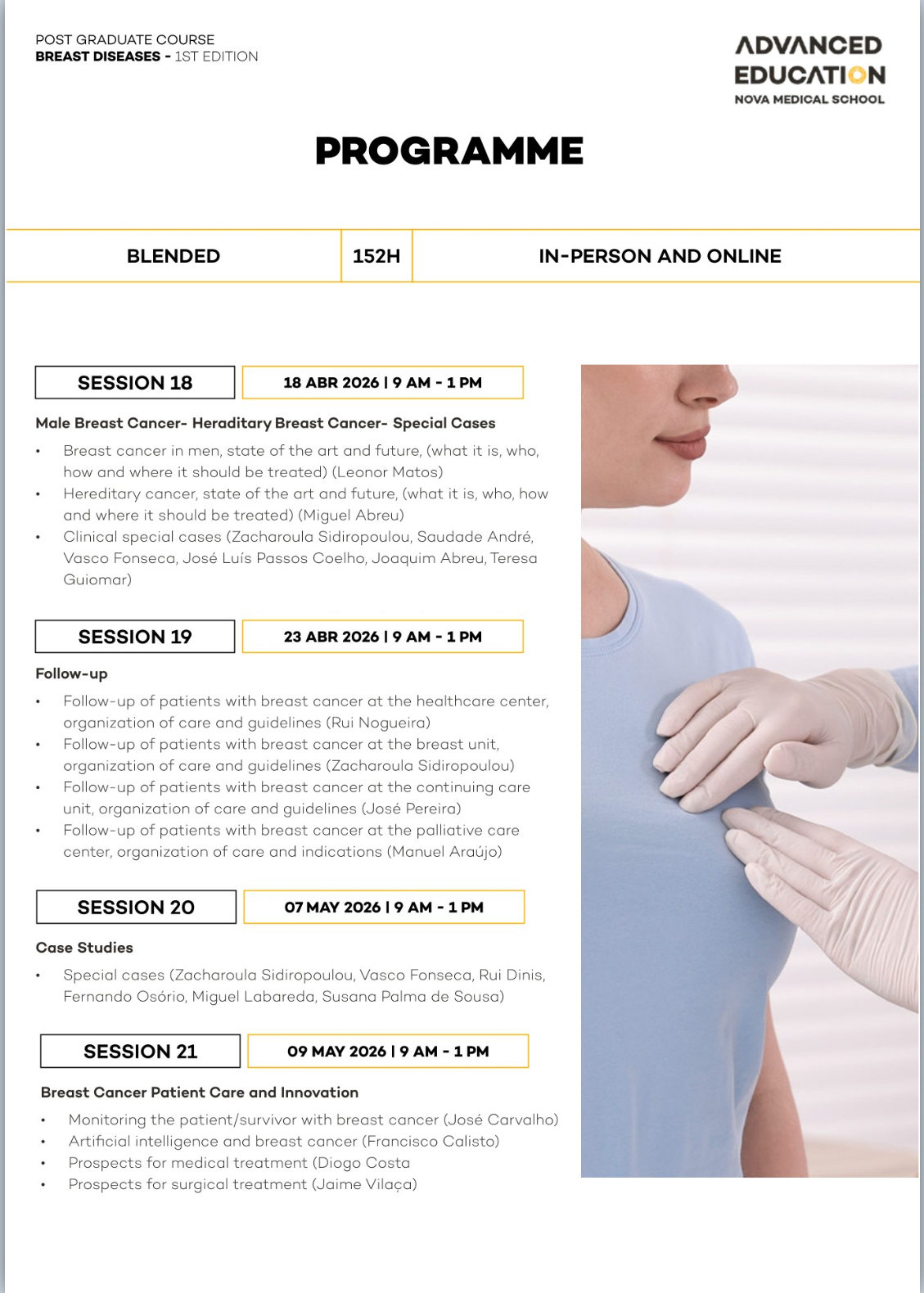 Advanced Training in Breast Diseases with NOVA Medical School – Faculdade de Ciências Médicas and Ahed – Advanced Health Education is a postgraduate program designed specifically for mid-career physicians ready to establish or lead breast cancer units in compliance with European quality standards.